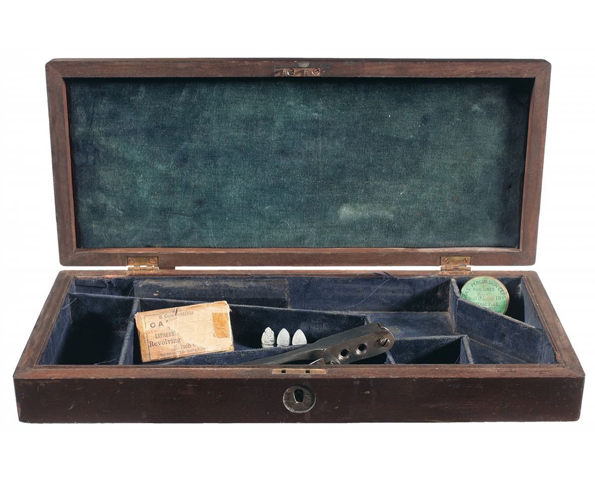This mahogany partitioned case is for a Remington Model 1858 Army revolver. The case has six compartments and is lined in blue velvet. The hardware is brass and the top of the lid is without an initial plaque. Included with the case are the following accessories: sealed Hicks No. 13 percussion cap, unmarked two cavity (round ball and conical) iron bullet mold with spru-cutter, package of six 44 caliber combustible cartridges.