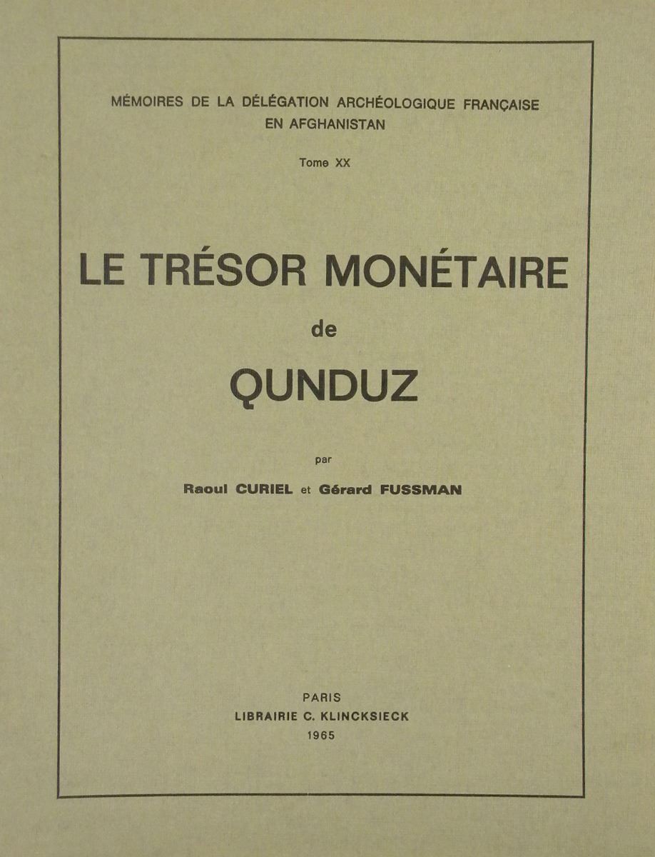 Curiel, Raoul, and Gérard Fussman. LA TRÉSOR MONÉTAIRE DE QUNDUZ. Paris, 1965. 4to, original printed card covers. 93 pages; 60 plates. Corner bump; near fine. Very scarce and important. Clain-Stefanelli 3223. Daehn 6314: "An analysis of a hoard of 627 Bactrian coins, mostly tetradrachmsÉ Includes a full catalogue of the coins."