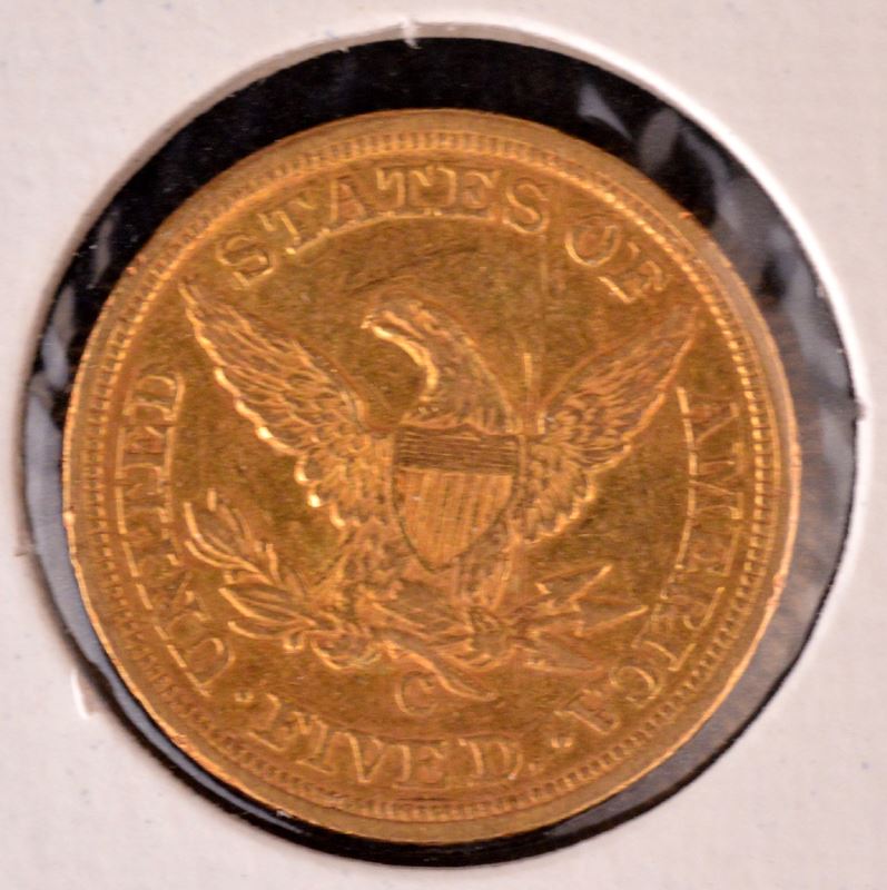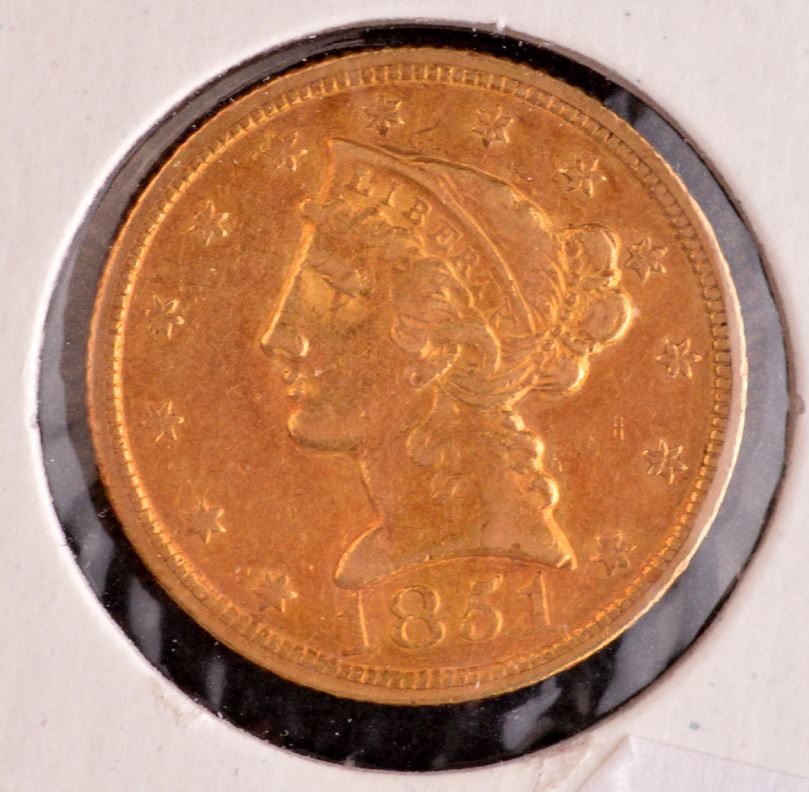 United States, Liberty $5, 1851-C, Charlotte Mint, EF, long reverse scratch. Scarce.