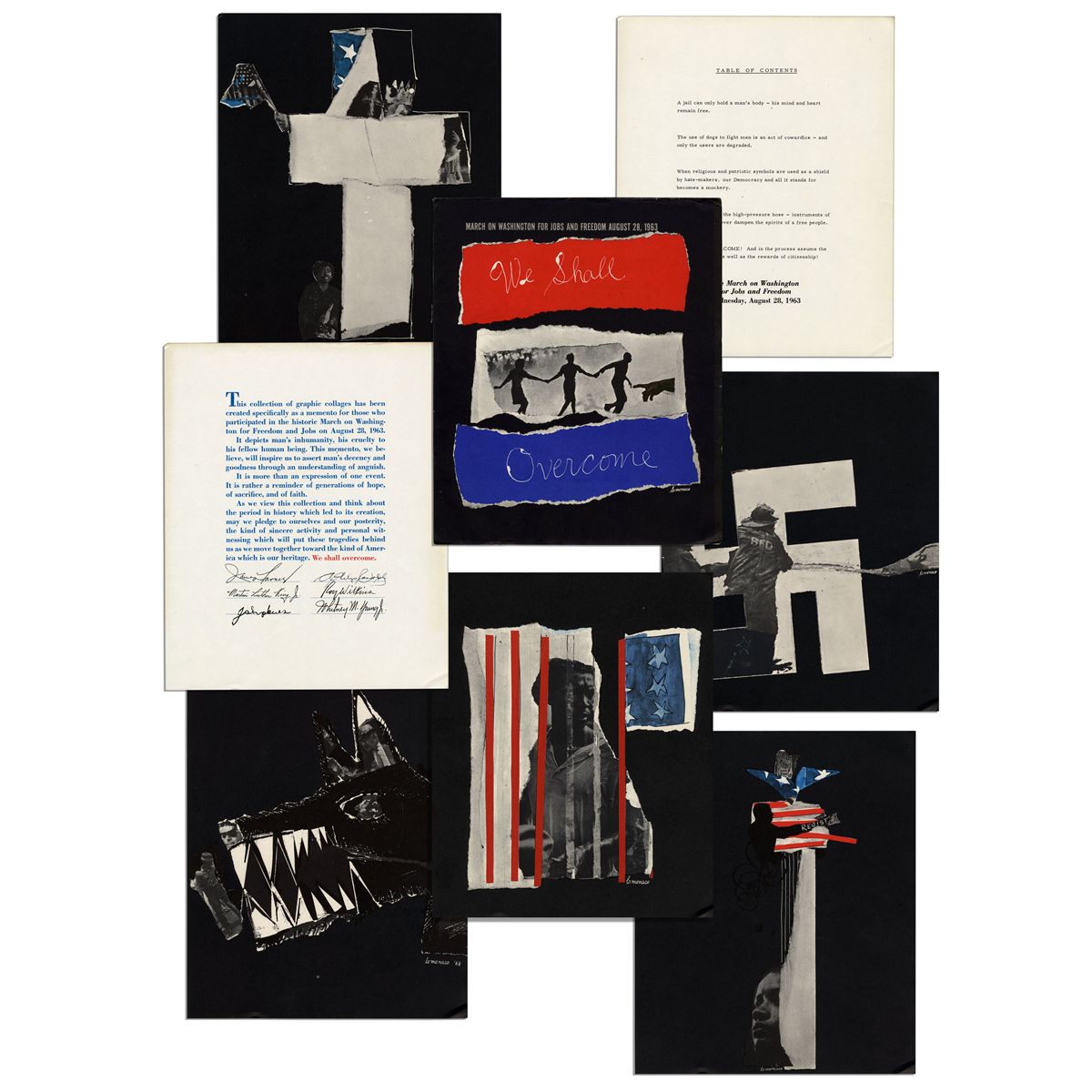 ''We Shall Overcome'' portfolio from the ''March on Washington for Jobs and Freedom'' held on 28 August 1963. New York: National Urban League: 1963. Scarce portfolio consists of seven unpaginated leaves including an introduction, table of contents and five collages by Louis LoMonaco, printed in halftone color on black paper. Housed in the original black paper portfolio, also featuring a collage by LoMonaco. From the introduction, ''This collection of graphic collages had been created specifically as a memento for those who participated in the historic March on Washington for Freedom and Jobs on August 28, 1963. It depicts man's inhumanity, his cruelty to his fellow being. This memento, we believe, will inspire us to assert man's decency and goodness through an understanding of anguish.'' Below this text are six facsimile signatures, including Martin Luther King, Jr., civil rights figure Roy Wilkins, and a man named Josephus, the last living slave. This portfolio is exceedingly rare and infrequently comes up for auction. There is a set housed in the New York Public Library and another copy at the Library of Congress, where it was displayed during the Library's Voices of Civil Rights exhibition in 2005. Portfolio and leaves measure 9.25'' x 11''. Light toning. Near fine.