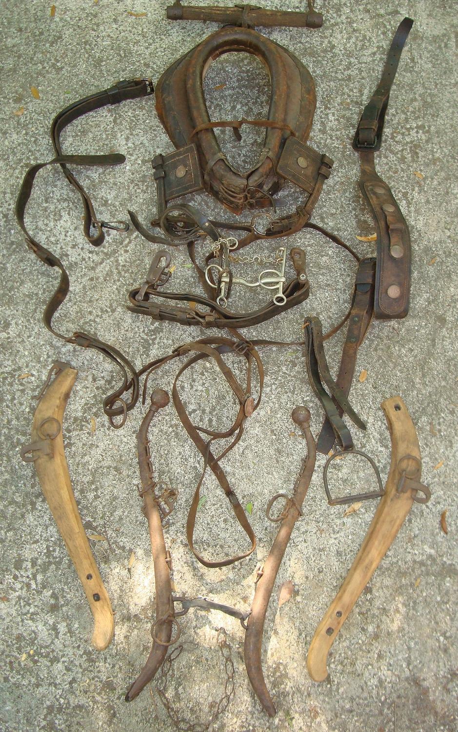 Rare 19th Century U.S. Army Mule Driving Harness Set. This unusual complete set came from a central Florida lady whose grandfather served in the U.S.Calvary in the 19th century. All the pieces in this set were hand forged with additional copper U.S. Army badges throughout many of the pieces. This set pre-dates World War 1 as the mules were all executed by the Army during that time instead of giving them away when their use was no loner in the Army’s plans. The wood used is carved from old world oak and one can see where all the pieces were hand rubbed by a craftsmen. The leather remains vibrant and strong despite obviously living through many battles. Without sounding arrogant but I would assume this is one of the few remaining sets known to exist, If not the only one? I have taken several photographs of this set for your consideration. Estate fresh.