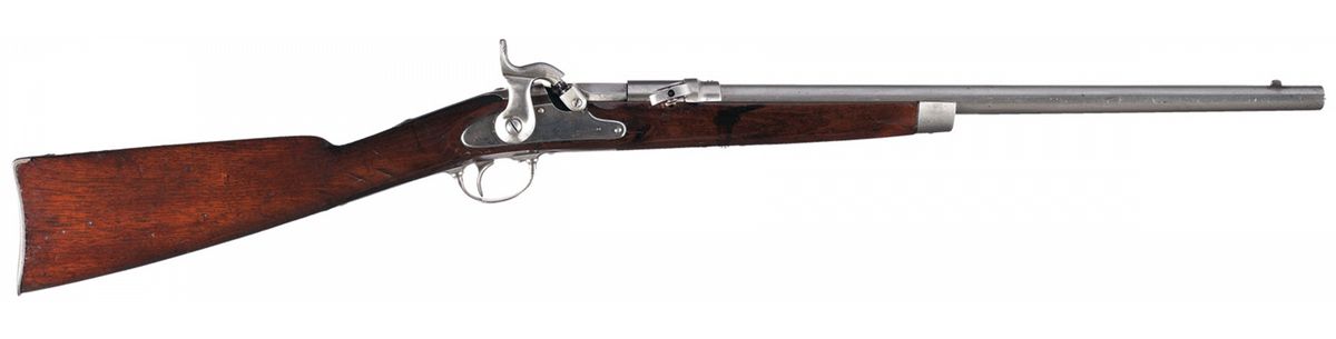 This is one of 892 First Type carbines manufactured by Edward Lindner of Manchester, New Hampshire. Of the 892 First Type carbines manufactured, 391 where delivered to the Michigan Cavalry circa November 1861 and 501 where delivered to the 8th West Virginia Mounted Infantry in late 1863. The carbine is loaded by turning a rotating collar locking device on the barrel 180 degrees to the left. The breechblock is then pushed upward by a spring. The carbine has the correct First Type breechblock patent date marking "EDWARD LINDER'S/PATENT/MARCH 29, 1859". The lock plate is correctly without markings. A saddle ring is mounted on the left side of the stock. The carbine has a blade front sight and a two leaf rear sight. The carbine has an inspector cartouche stamped near the buttplate tang.