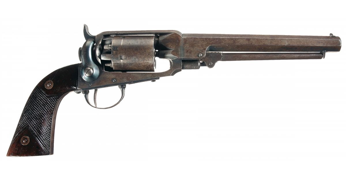 These revolvers were manufactured circa 1861-62. Approximately 3,000 of this Civil War era revolver were manufactured by the Joslyn Firearms Company of Stonington, Connecticut. Some of these revolvers were purchased through the open market and were issued to the U.S. military with almost all of the revolvers issued to the 5th and 6th Ohio Cavalry regiments. The top barrel flat is stamped "B.F. JOSLYN/PATD MAY 4th 1858.". This standard model revolver has an iron trigger guard, a solid frame, a 5-shot cylinder, a side mounted hammer and checkered walnut grips. The matching full serial number "1140" is stamped on the butt and barrel with the number "1617" on the loading lever and "40" on the loading lever catch. The cylinder has the number "5800." The underside of the frame ahead of the trigger guard plate and the loading lever catch are stamped with the letter "B". Fitted with a set of checkered walnut grips with "1140" on the inside of each grip.