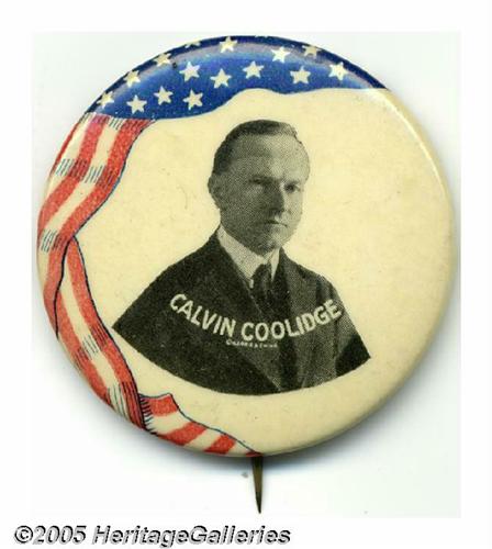 <B>Scarce, Colorful Large 1 3/4" Calvin Coolidge Campaign Pin from 1924</B></I> One of the few larger buttons with any design "pizzazz" for this tough candidate. Button designs for the 1920s candidates were largely drab and uninteresting, despite the rarity of many. (Perhaps folks of that era considered them too bland to save!) Excellent condition. Lot:263