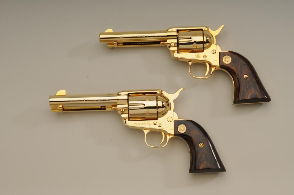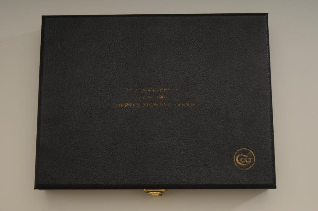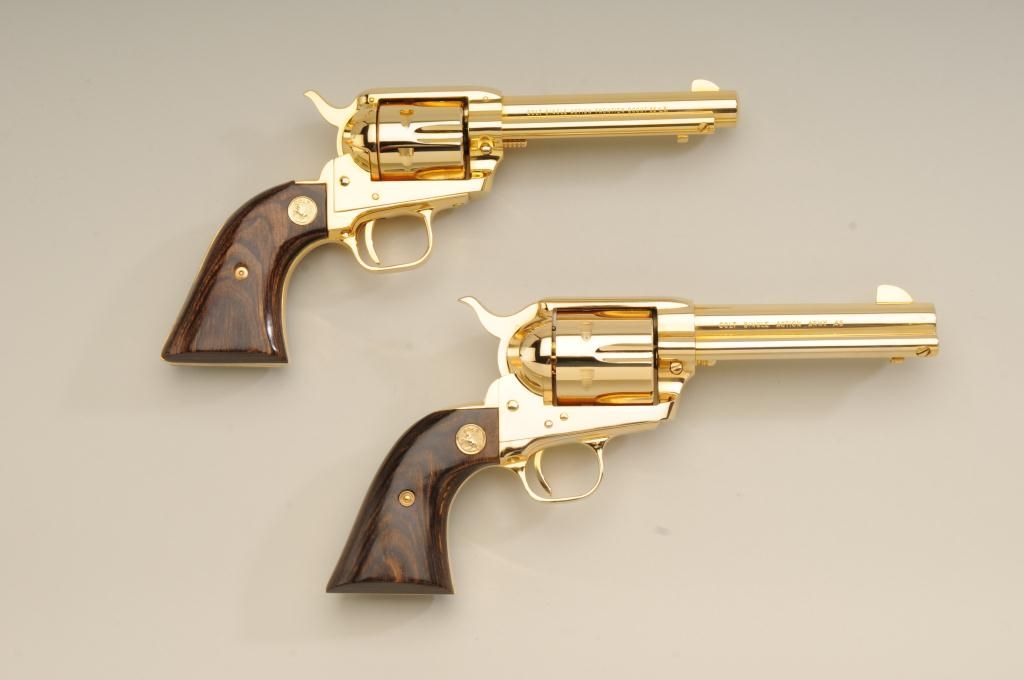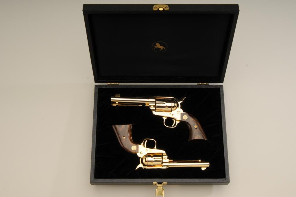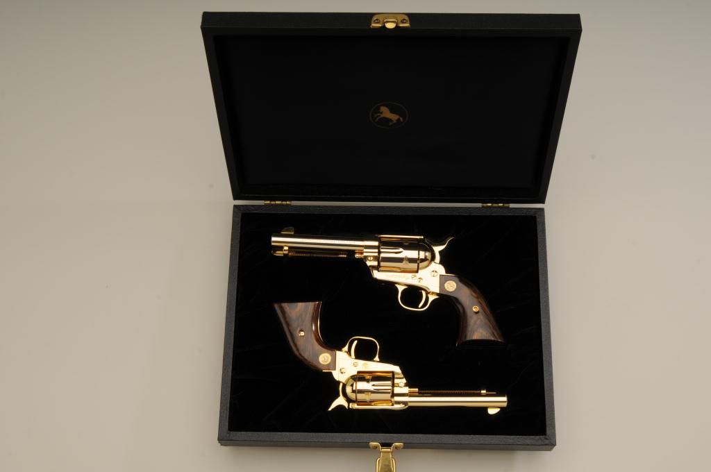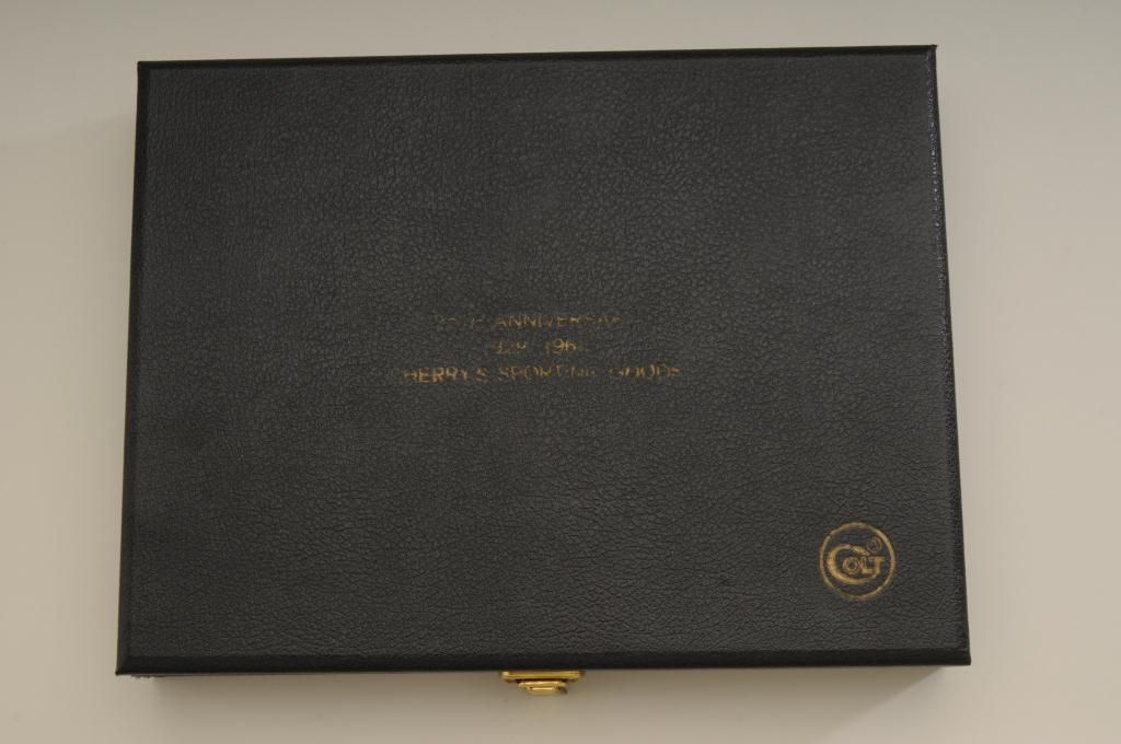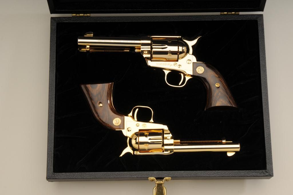 Scarce Colt/Cherry’s Sporting Goods commemorative two gun set marked 1923 – 1984 factory gold plated, .45 caliber long Colt with 4 ¾” barrel and .22 caliber scout both numbered 51 in the series. The pair aremounted with fancy woodgrain grips with gold medallions and retain all their original gold finish with no evidence of firing or use just some very slight handling and minimal oxidation with a couple of minor scratches.The pair are contained within their original deluxe presentation display case. Knowledgeable collectors estimate about 100 produced and seldom seen. Est.: $1,400-$2,800