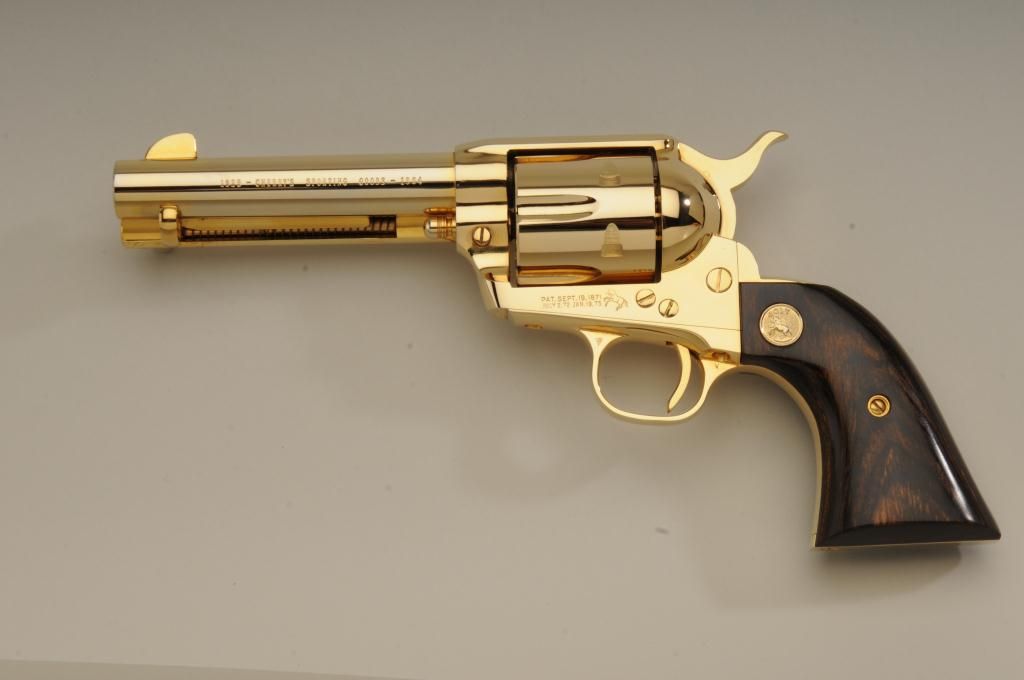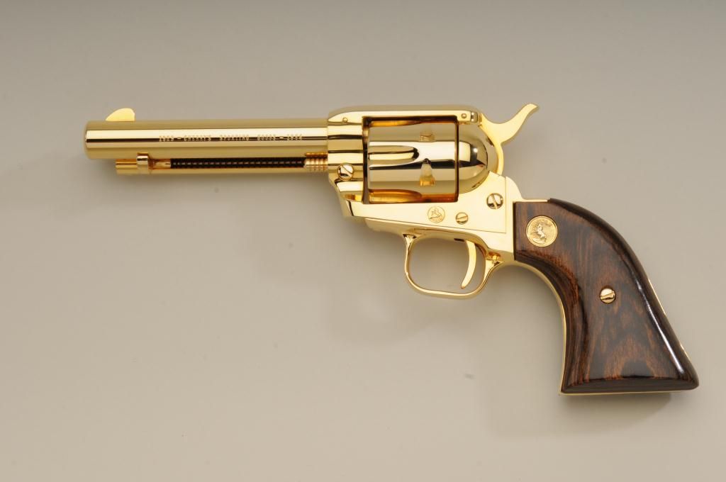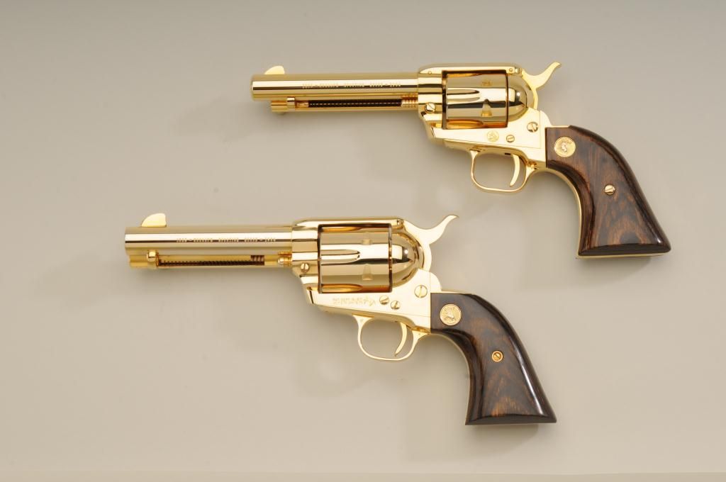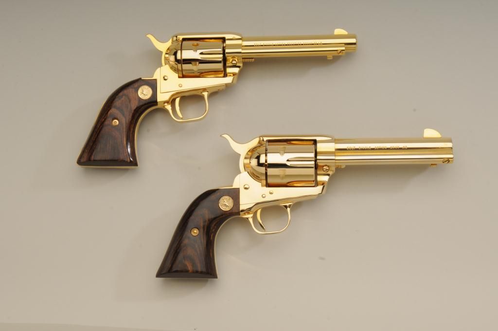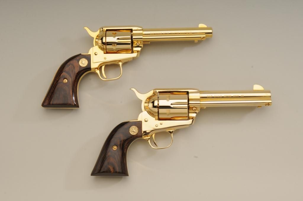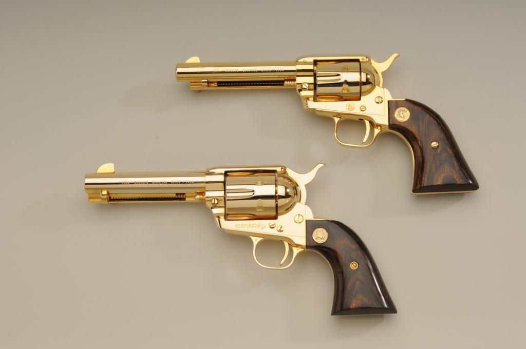 Scarce Colt/Cherry’s Sporting Goods commemorative two gun set marked 1923 – 1984 factory gold plated, .45 caliber long Colt with 4 ¾” barrel and .22 caliber scout both numbered 51 in the series. The pair aremounted with fancy woodgrain grips with gold medallions and retain all their original gold finish with no evidence of firing or use just some very slight handling and minimal oxidation with a couple of minor scratches.The pair are contained within their original deluxe presentation display case. Knowledgeable collectors estimate about 100 produced and seldom seen. Est.: $1,400-$2,800