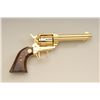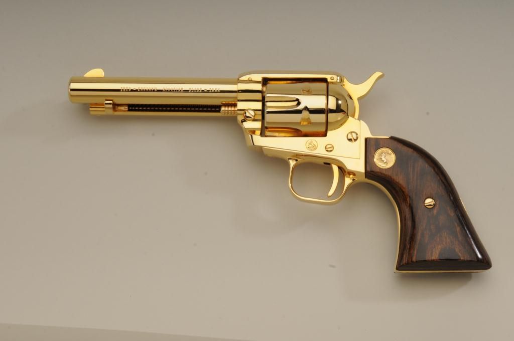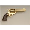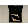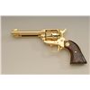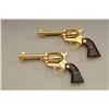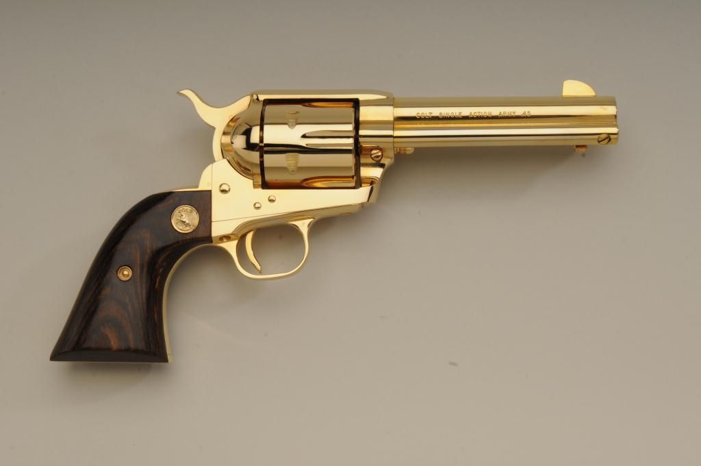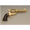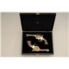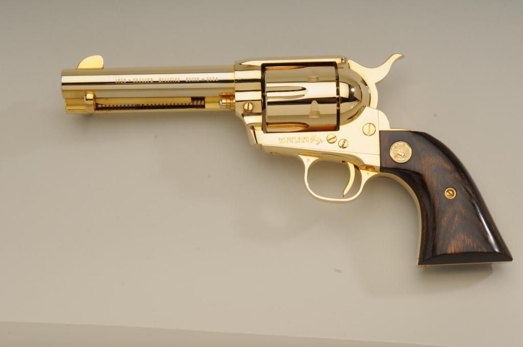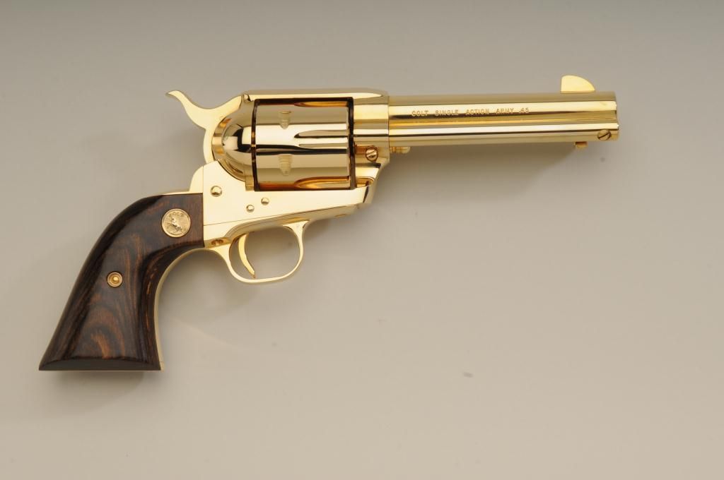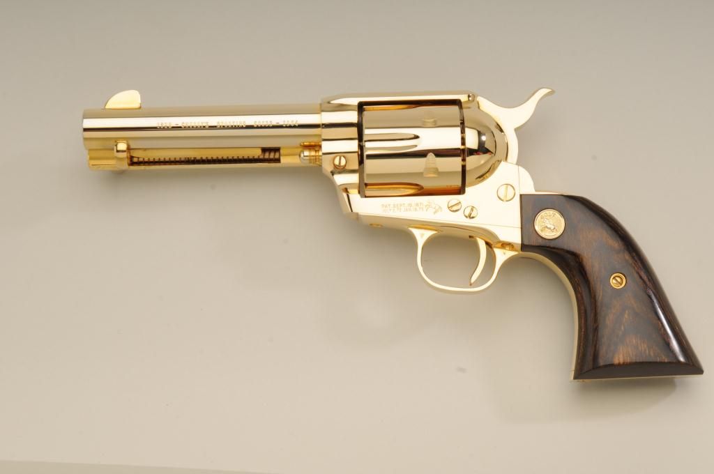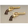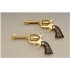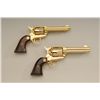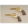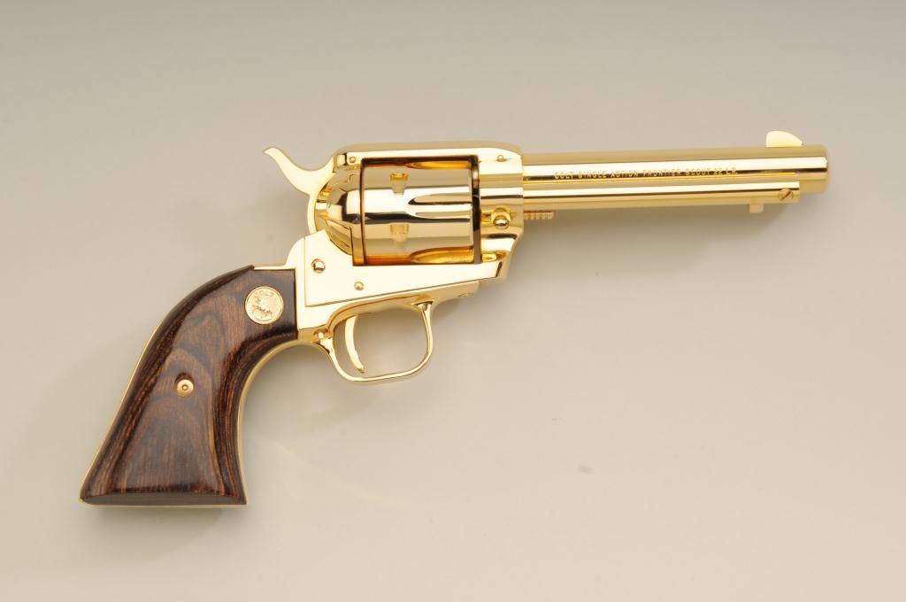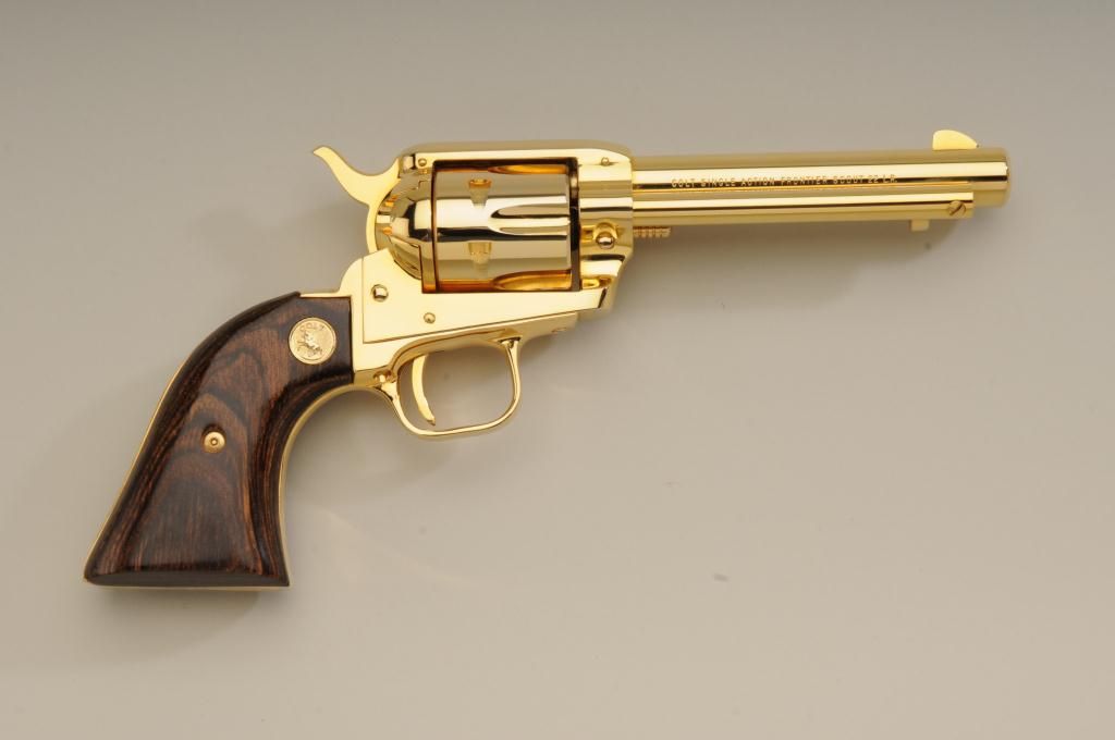 Scarce Colt/Cherry’s Sporting Goods commemorative two gun set marked 1923 – 1984 factory gold plated, .45 caliber long Colt with 4 ¾” barrel and .22 caliber scout both numbered 51 in the series. The pair aremounted with fancy woodgrain grips with gold medallions and retain all their original gold finish with no evidence of firing or use just some very slight handling and minimal oxidation with a couple of minor scratches.The pair are contained within their original deluxe presentation display case. Knowledgeable collectors estimate about 100 produced and seldom seen. Est.: $1,400-$2,800
