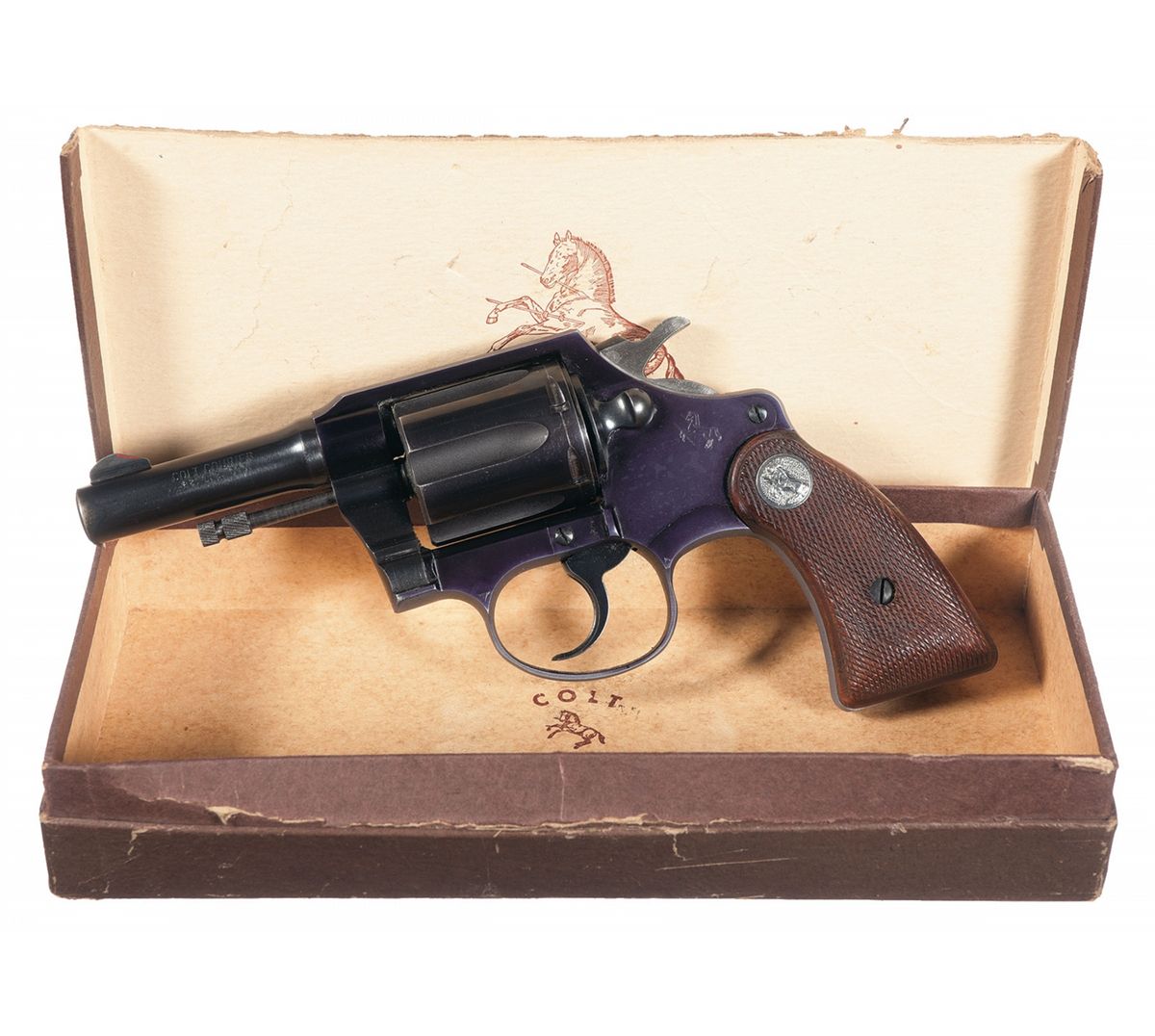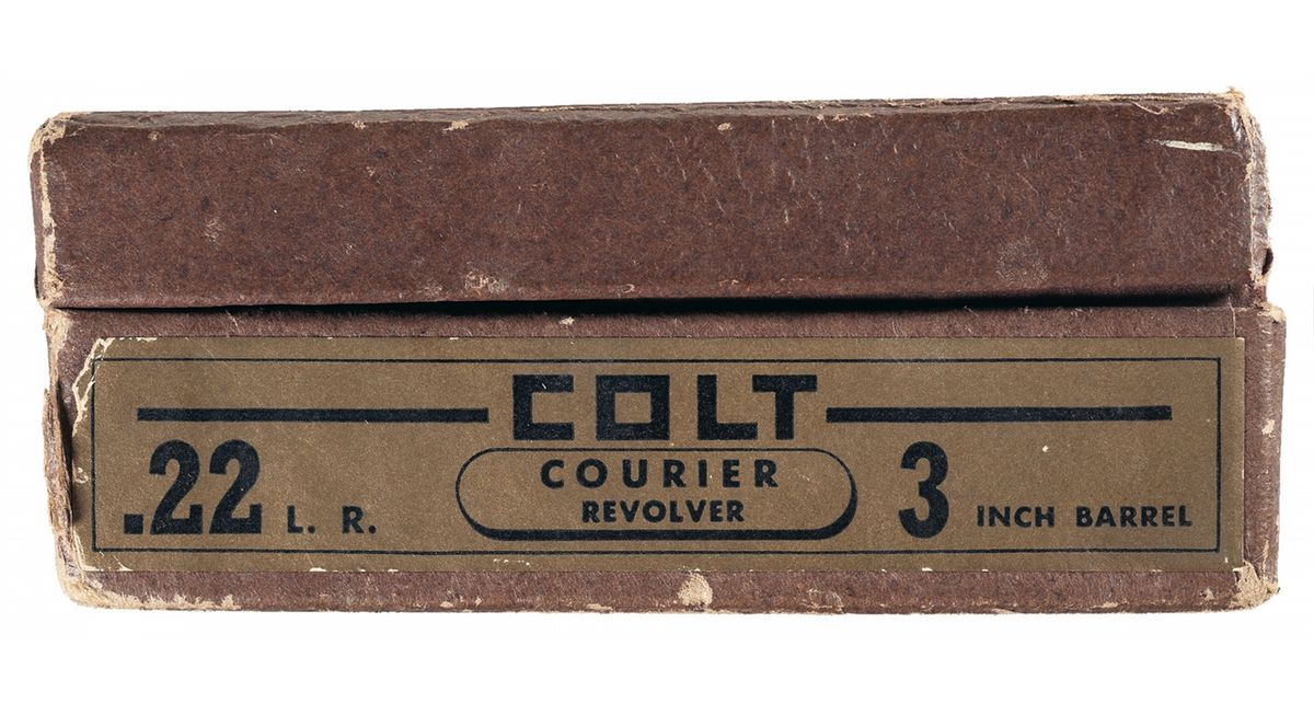 This example was manufactured in 1955. Lightweight alloy frame with steel six shot cylinder. Serrated blade front sight with square notch fixed rear sight, the face of the sight has some red paint highlight added. The left side of the barrel is marked "COLT COURIER/.22 L. R. CTG." and the right side of the barrel is marked "COLT'S MFG. CO./HARTFORD CT. U.S.A.". The Rampant Colt motif is stamped on the left side of the frame. Exposed ejector rod, checkered grips with silver Colt medallions. Complete with an original brown hinged lid Colt box having the gold label with black lettering on one end.