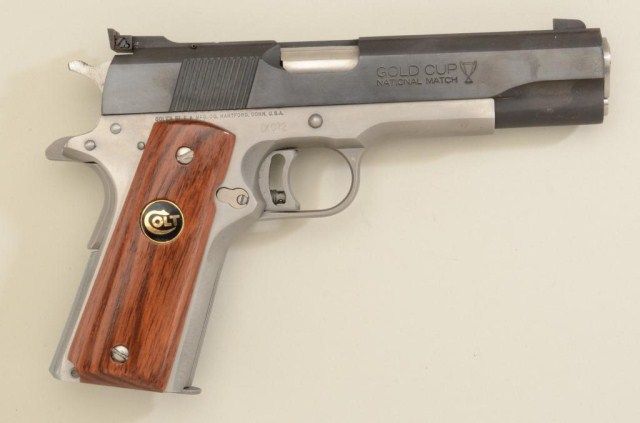 Scarce Colt Elite IX Gold Cup National Match 9mm Luger cal, blue and stainless, #IX072; near excellent overall, approx. 95-98% overall showing slight use; limited production; we have seen only 3; estimatedonly a few hundred produced. Est.: $700-$1,400.