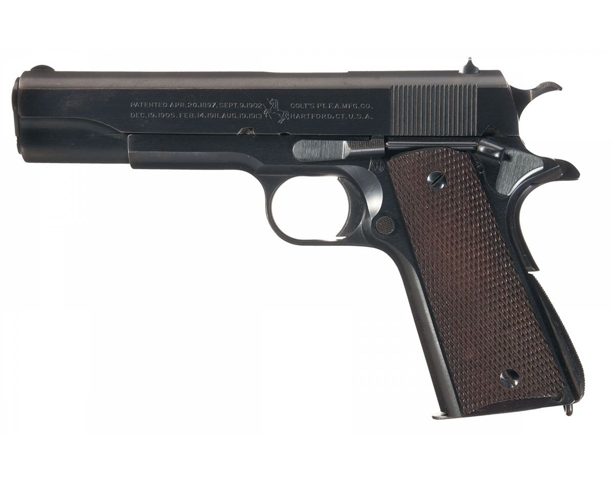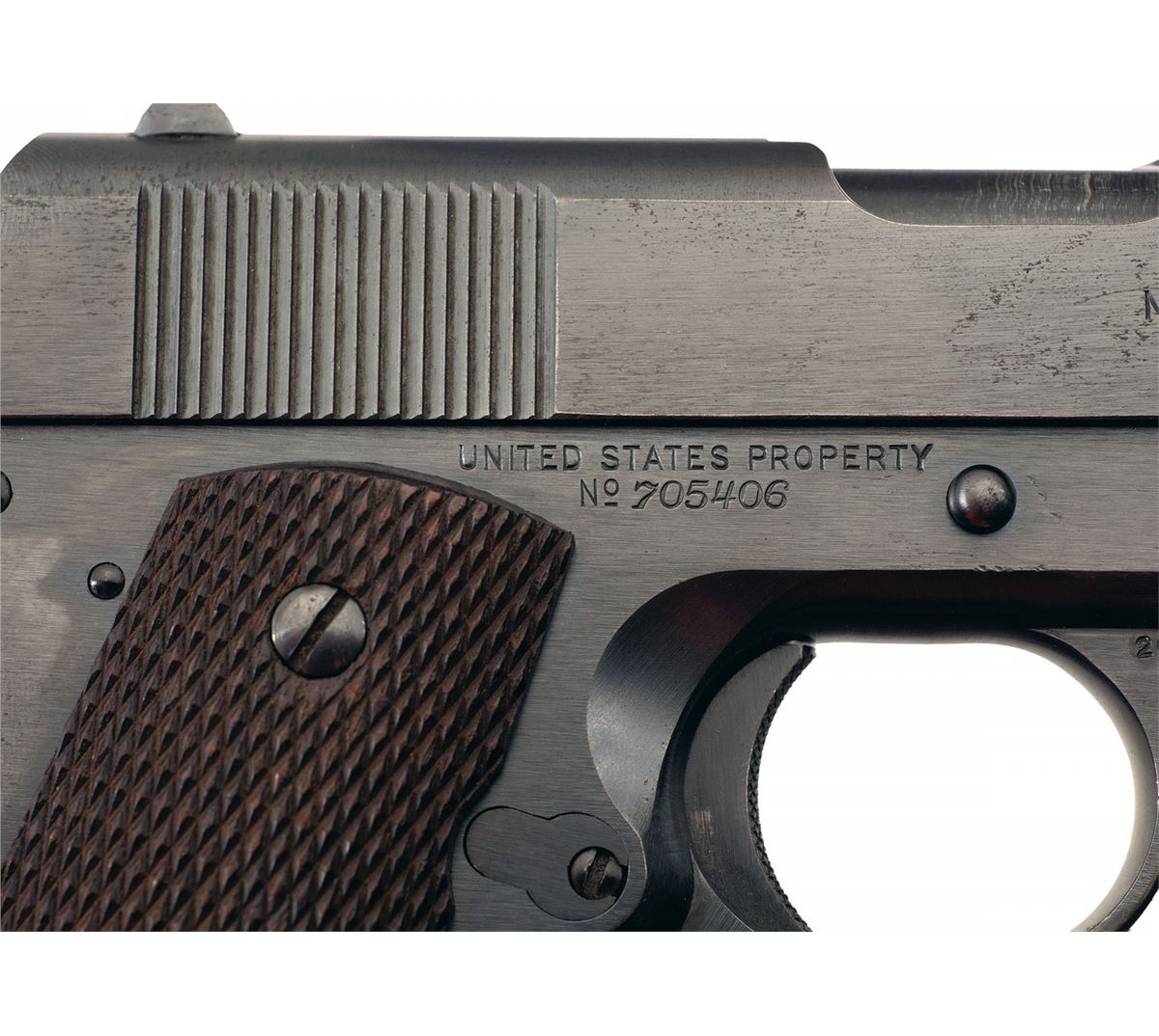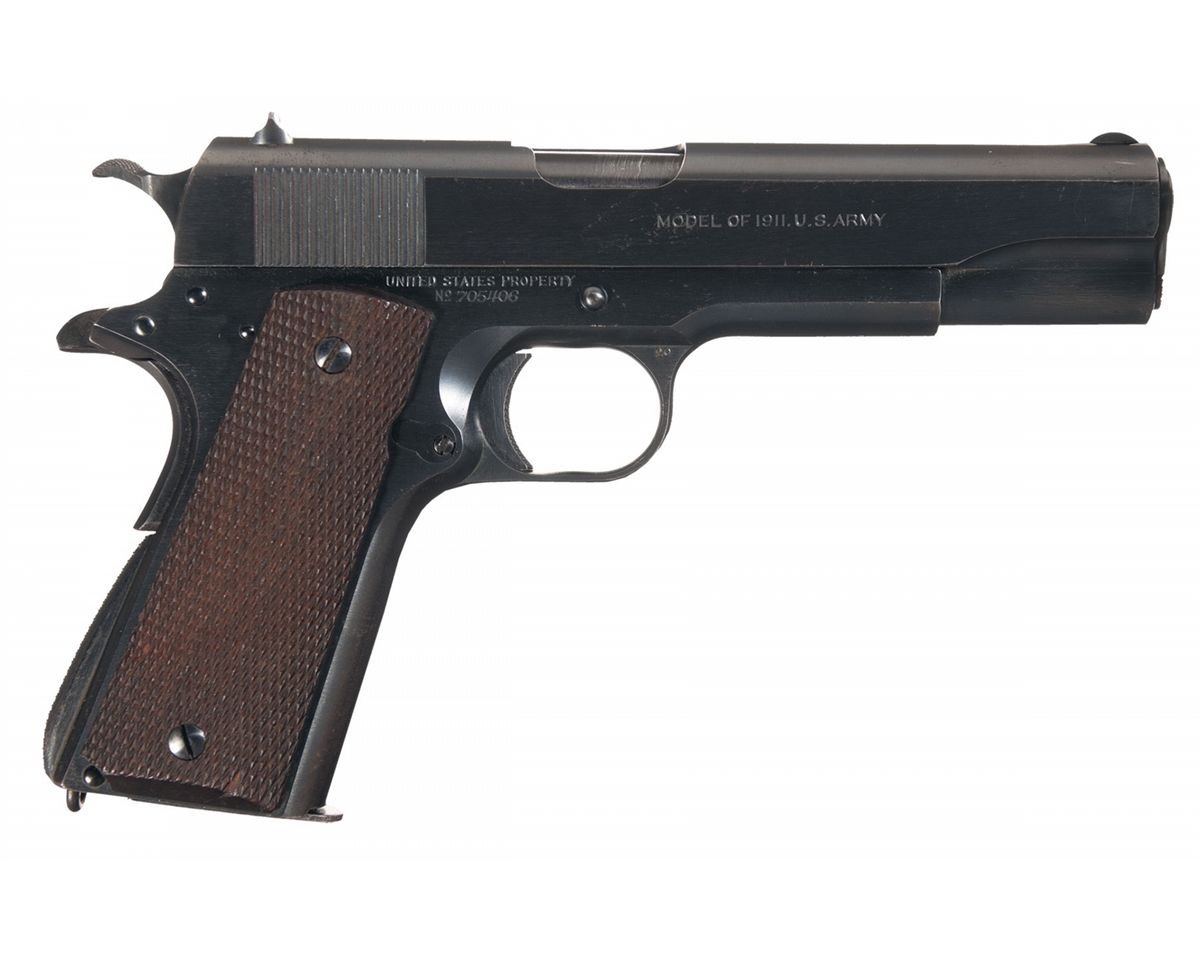 This is a beautiful example of an original Colt "Transition Model" Model 1911A1 pistol that was manufactured in 1924. This series of pistol was fairly short lived and basically ushered in the improved version of the WWI Colt Model 1911 pistol before the Model 1911A1 was formally adopted by the U.S. Army. The pistols retained the M1911 slide markings but were produced with the new Model 1911A1 modifications. These modifications include: (1) extended grip safety tang, (2) knurled and raised mainspring housing, (3) radius clearance cuts machined into the frame behind the trigger, (4) cut back trigger with a knurled face and (5) wider front sight blade. The left side of the slide is stamped with the two-line, two-block, Colt 1897-1913 patent dates factory address followed by the Rampant Colt in the middle. The right side of the frame is stamped "UNITED STATES PROPERTY/No 705406" behind the slide stop hole, with the left side stamped with the U.S. Ordnance, inspector's initials "WTG". The top of the frame is stamped with an "H" provisional inspection mark along with a "G" government production order mark. The slide is correctly not serial numbered and the chamber area of the barrel is stamped with the intertwined "HP" firing proof and no other markings. It is fitted with the early, correctly checkered, slide stop. Thumb safety, main spring housing and the wide spur hammer.The pistol has the brush military blue finish and is fitted with the full-checkered walnut grips as adopted in 1924.