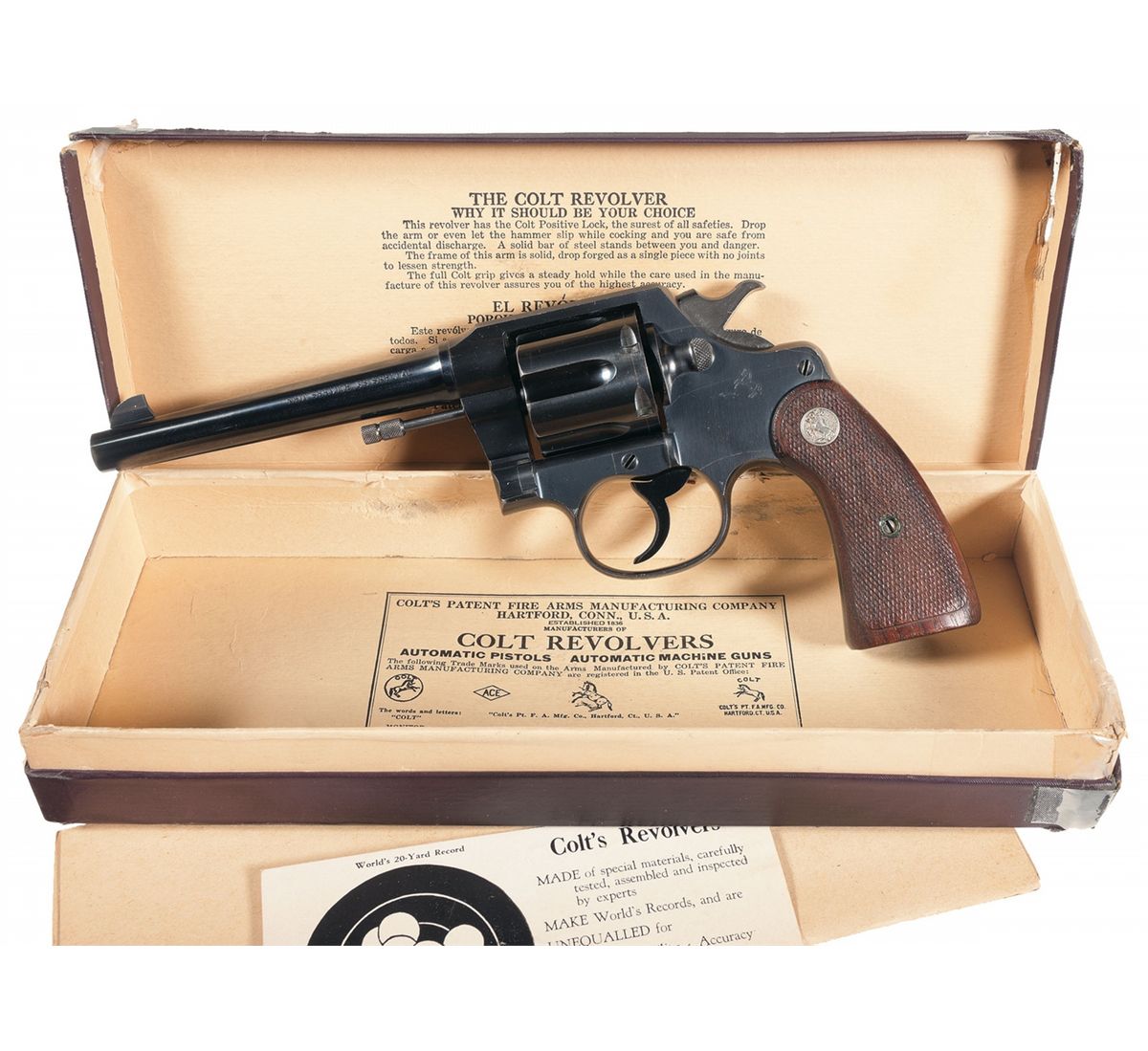 This example was manufactured in 1933 and features fixed blade front and notch frame rear sight. The barrel has the standard two line address and patent date markings on the top and is marked on the left side "NEW SERVICE 38 SPECIAL". The frame is marked on the left side with the Rampant Colt, Verified Proof, and "3" inspector's mark. This revolver features a checkered hammer and trigger, round cylinder latch, two section knurled ejector rod head and checkered grips with silver Rampant Colt medallions. Includes the maroon hinged lid box, which has the matching number crossed out on the bottom and another number added, and some papers.