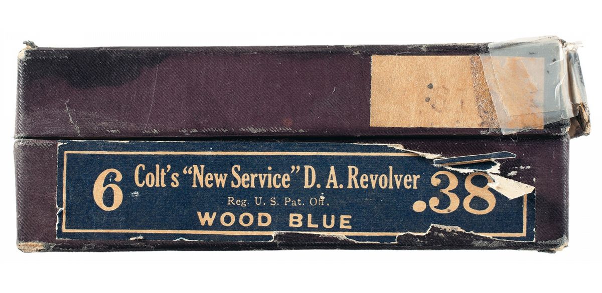 Condition: Excellent 98% original finish showing scattered minor scratches, some finish loss on the sides of the muzzle, and some sharp edge wear, a light turn line on the cylinder, with crisp original markings. The grips are excellent having some minor handling wear with well defined checkering. The box has some age wear with some tape repairs to corners, the label is intact, beginning to come loose on one corner.