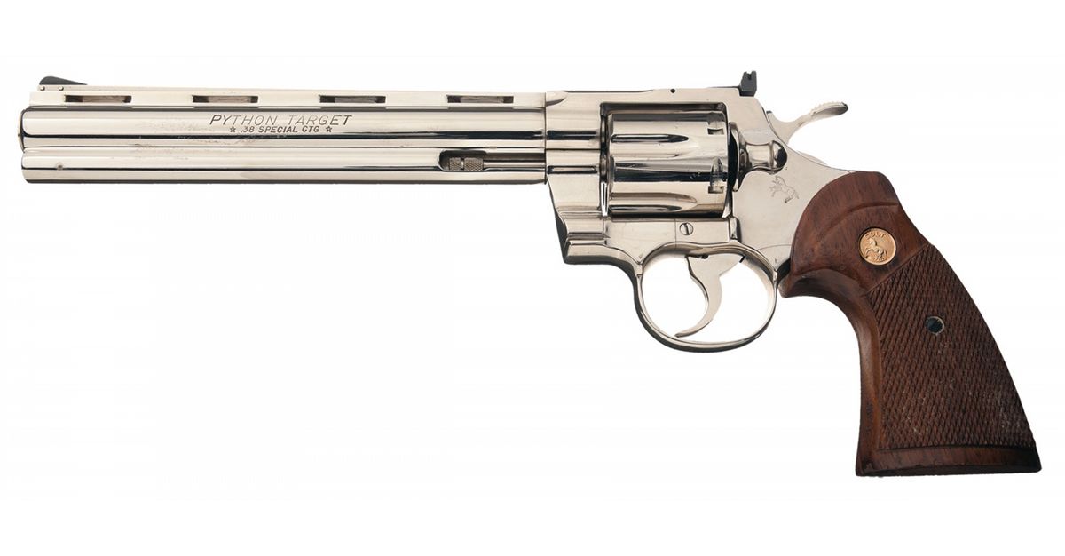 A quality example of one of the rarest Colt Pythons. Ramp front and adjustable rear sights, with "PYTHON TARGET/38 SPECIAL CTG" on the left side of the barrel, a Rampant Colt on the frame, serrated trigger and back strap, wide checkered hammer, and walnut grips.