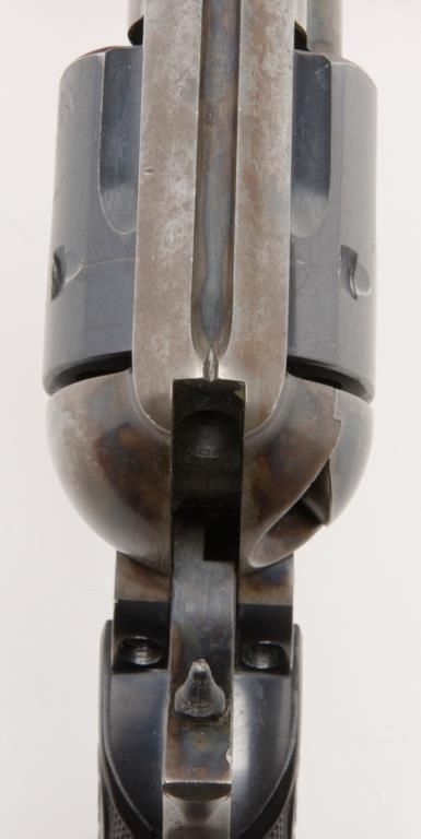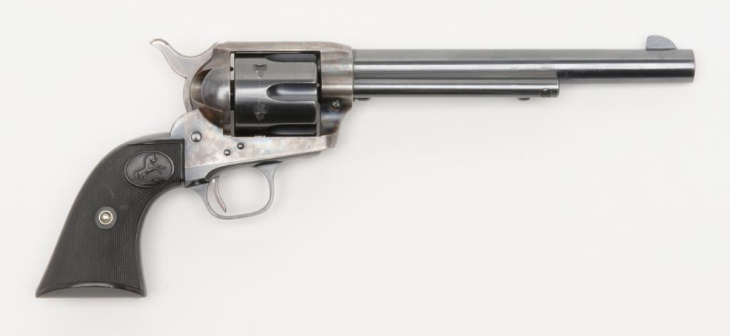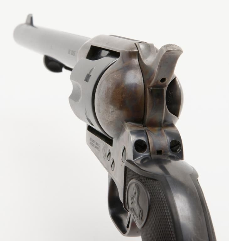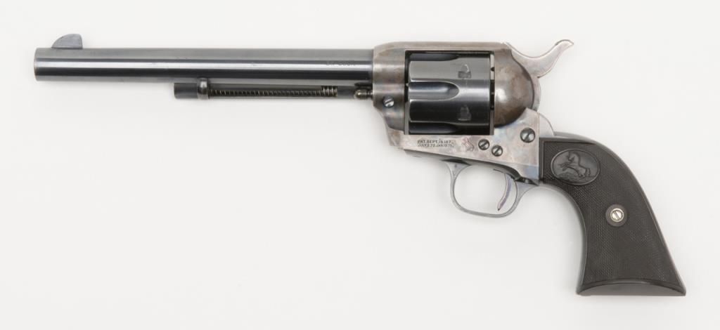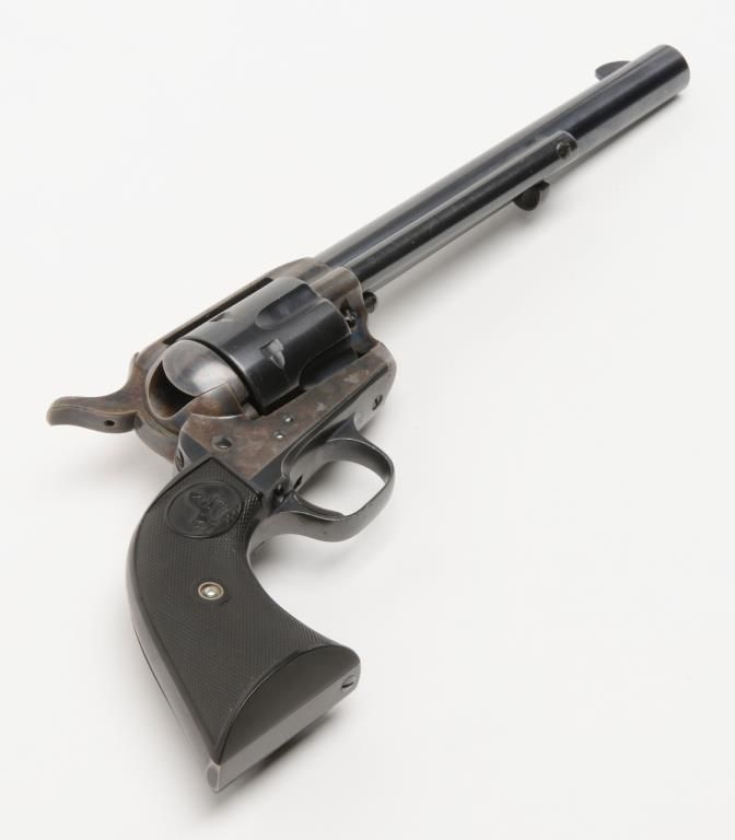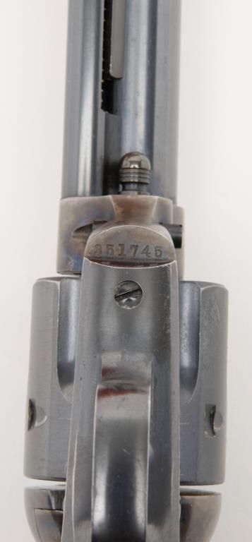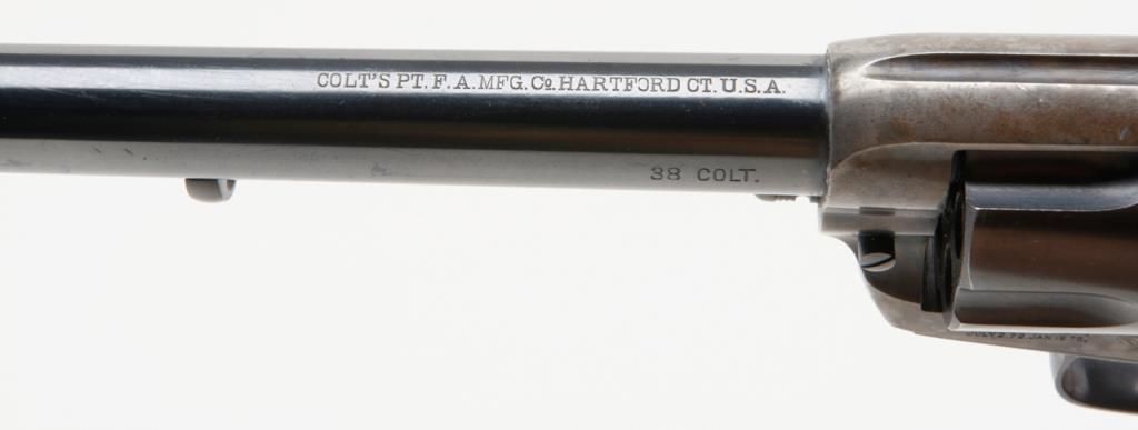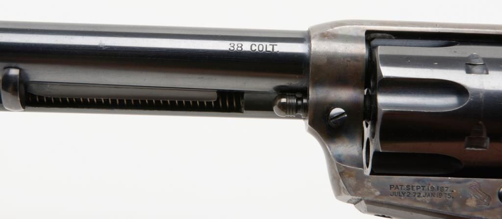 Scarce Colt SAA revolver, .38 Colt cal., 7-1/2” barrel, blue and case hardened finish, checkered hard rubber grips, #351745 in overall excellent condition showing approx. 98%+ original blue finish on barrel, cylinder, straps and ejectorhousing with feathering marks still visible on both sides of the front sight; approx. 96% original case colors on the frame and approx. 99% original case colors on the hammer; fine bore, crisp action, sharp markings and fine grips;accompanied by two factory letters, both confirming caliber, barrel length, finish and grips, indicating shipment to L.S. Knoek Co., Hartford, CT. on March 6, 1929, one gun in shipment. According to Graham, Kopec and Moore’sA Study of the Colt Single Action Army Revolver, A Thirty Year Anniversary Edition, on page 163, “Although after 1912 the .41 Colt caliber was no longer advertised in the company’s sales catalogs, a limited number of .41 Colt SAs continued to beassembled and shipped . . . . Likewise, while most of Colt’s 1913 through 1922 catalogs were available to our research, no mention of the .38 Colt chambering was found. However, SAs in this caliber were shipped in late 1915 and early 1916.