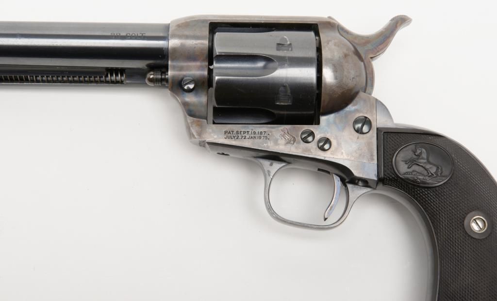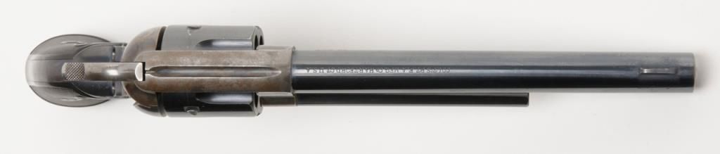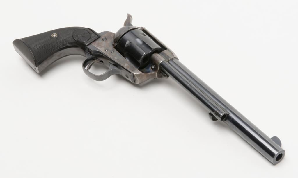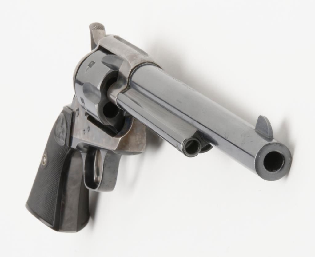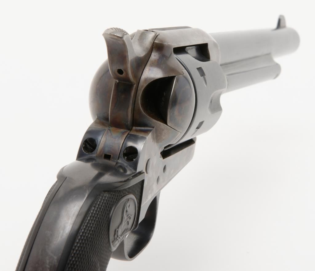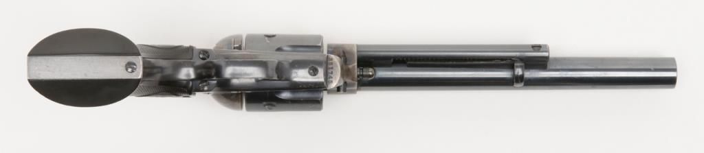 Scarce Colt SAA revolver, .38 Colt cal., 7-1/2” barrel, blue and case hardened finish, checkered hard rubber grips, #351745 in overall excellent condition showing approx. 98%+ original blue finish on barrel, cylinder, straps and ejectorhousing with feathering marks still visible on both sides of the front sight; approx. 96% original case colors on the frame and approx. 99% original case colors on the hammer; fine bore, crisp action, sharp markings and fine grips;accompanied by two factory letters, both confirming caliber, barrel length, finish and grips, indicating shipment to L.S. Knoek Co., Hartford, CT. on March 6, 1929, one gun in shipment. According to Graham, Kopec and Moore’sA Study of the Colt Single Action Army Revolver, A Thirty Year Anniversary Edition, on page 163, “Although after 1912 the .41 Colt caliber was no longer advertised in the company’s sales catalogs, a limited number of .41 Colt SAs continued to beassembled and shipped . . . . Likewise, while most of Colt’s 1913 through 1922 catalogs were available to our research, no mention of the .38 Colt chambering was found. However, SAs in this caliber were shipped in late 1915 and early 1916.