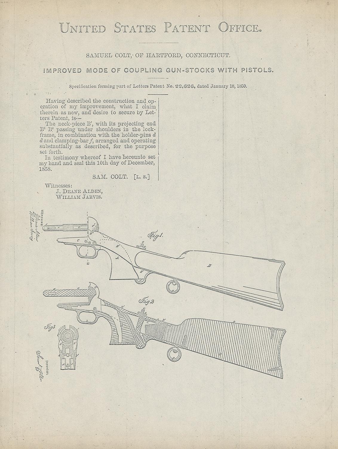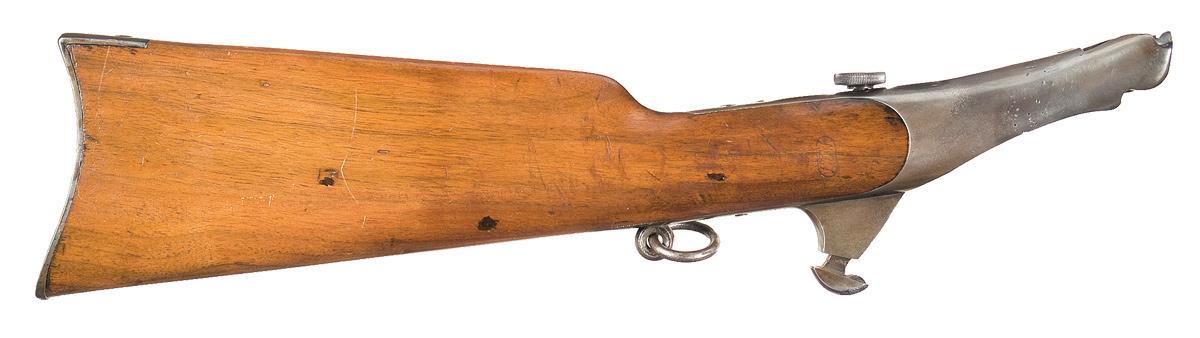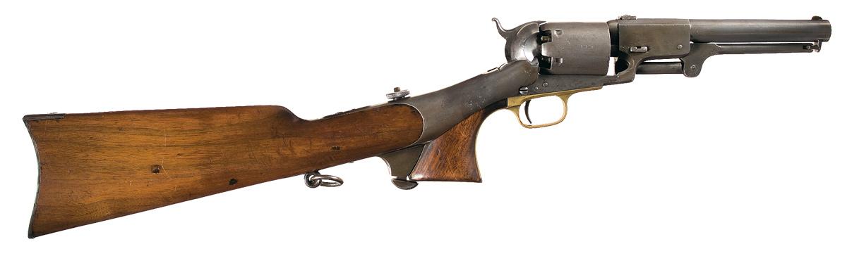 Produced in 1858, with the distinctive four-screw frame, recoil shield cutouts and folding leaf rear sight. The shoulder stock is the third pattern, with a sling ring mounted behind the hook, the number "17327/1732" on the underside of the tang, the Ordnance inspector's script initials "WAT" in an oval on the right wrist and the initials of the Ordnance sub-inspector in an oval on the left. The revolver is marked: "-ADDRESS SAML COLT NEW--YORK CITY- " in a single line on the top of the barrel, partially obscured by the rear sight. The cylinder is roll-engraved with the Indian and Ranger scene and "MODEL U.S.M.R./COLTS PATENT" on either side of the serial number, and the left front of the frame is marked "COLTS/PATENT/U.S." in three lines. The initial "C" is stamped on the cylinder, "K" is stamped on the backstrap and on the trigger guard and "M" is stamped on the left trigger guard shoulder and the upper left barrel flat. The full serial number, "17171" is stamped on the barrel, frame, trigger guard, backstrap and cylinder. The top of the loading lever is stamped "7171". With documentation from a previous owner, including a copy of the Samuel Colt's patent for the buttstock in this lot.