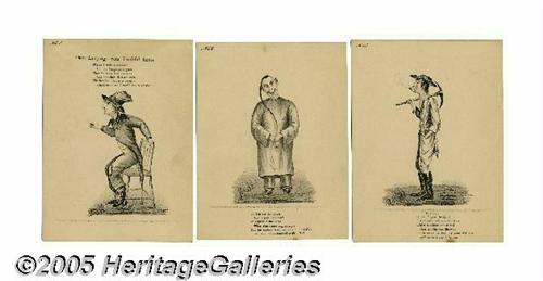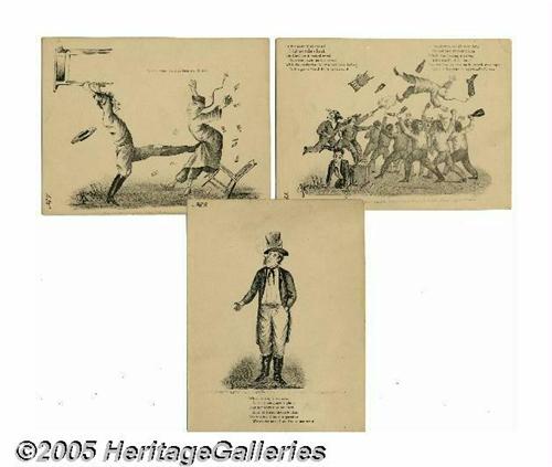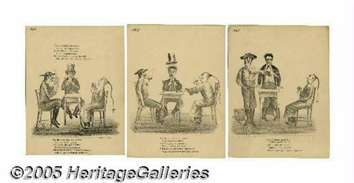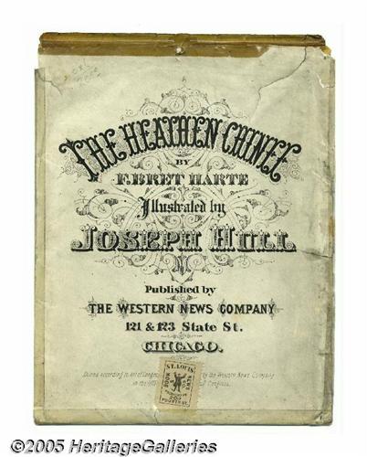 <B>Scarce Complete Set of Nine "The Heathen Chinee" 1870</B></I> "THE HEATHEN CHINEE," complete set with original cover and nine lithographed cards, by Bret Harte, illustrated by Joseph Hull, first edition, published by the Western News Company, Chicago, Illinois, 1870. Cover very good; cards choice extremely fine. A rare, early stereotypical derogatory text and cards, each approximately 7" x 5.5", lithographed after Joseph Hull, in original envelope. A few minor stains to the cards, and the envelope is soiled and torn in places, with tape around each edge. But the key feature of this collection is the marriage between racist imagery and derogatory narrative, which reflected the antipathy against Chinese immigrants and their offspring in late-19th century America. This particular text ends with "Ah Sin," the "Heathen Chinee," being lynched. A real, museum-quality collection. First edition, second printing, BAL 7248. Ten items. Lot:253