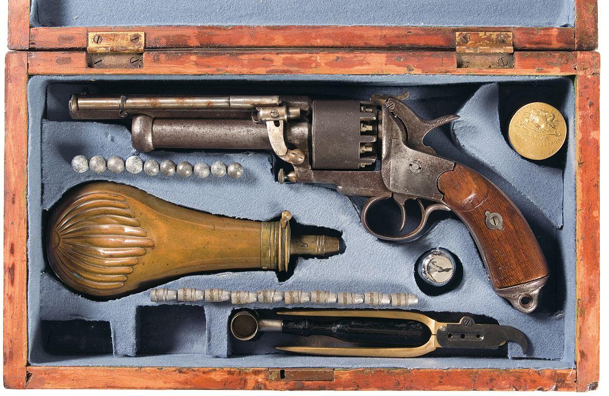 Blade and hammer notch sights, with the Paris address on the barrel, "V" and "GP" London proofs on the barrel, cylinder and shot tube, extendable ramrod, floral design screws, checkered grips and lanyard ring. With a London Armory labeled case, oiler, powder flask, cap tin, shot measure and shot/ bullet mold. Number of replaced parts.