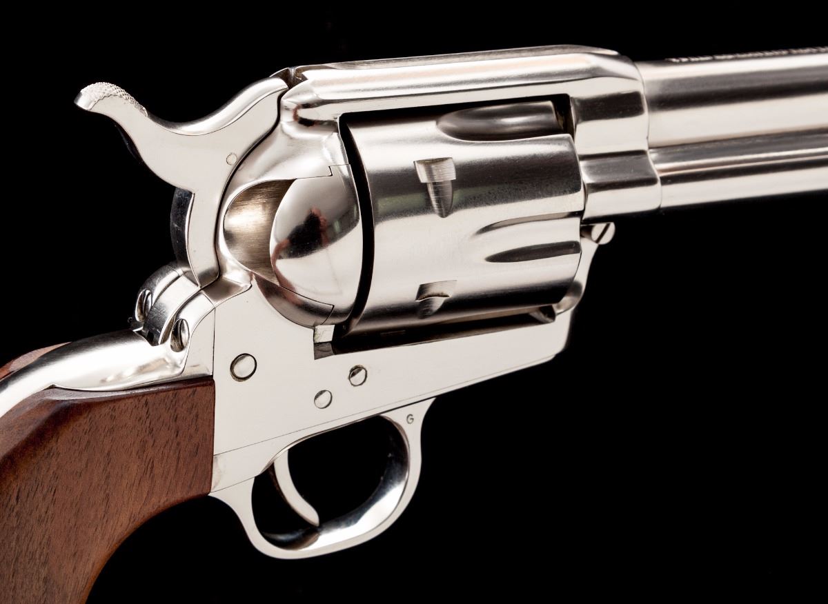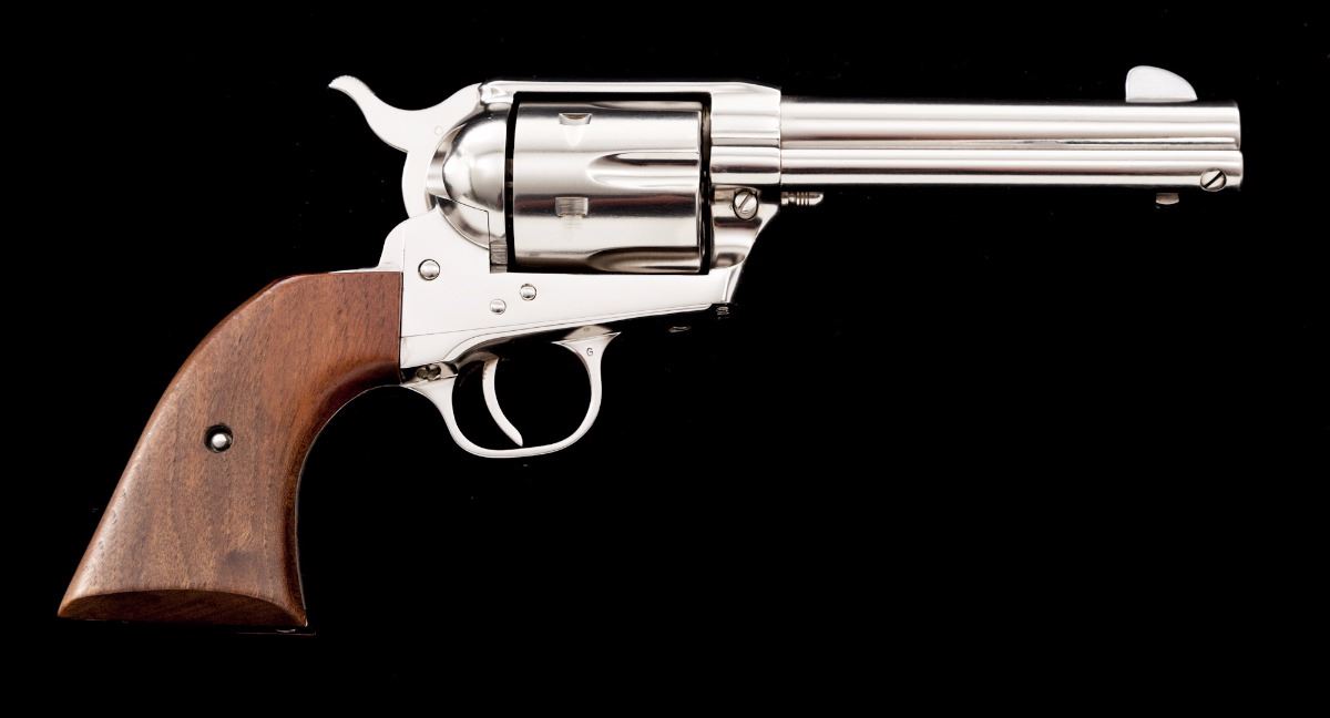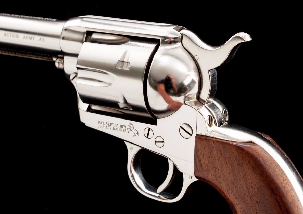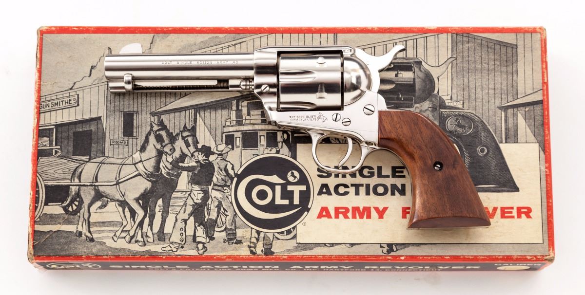 Scarce Configuration Colt 2nd Generation Single Action Army Revolver, #60137SA, .45 LC cal., 4.75'' barrel, factory nickel finish, smooth walnut grips, standard sights, in original two-piece Colt stagecoach box with fitted cardboard insert, owner's manual, and factory letter verifying all features. Mfg'd and shipped in 1971 to the San Francisco Gun Exchange in a one-gun shipment. Condition is excellent and possibly unfired, as the cylinder shows virtually no dragline and no powder residue or darkening to the face. Bore is mirror bright. Metal surfaces with scattered fine micro-scratching as is common on nickel-finished guns. Grips with only a few minor marks from handling. Stagecoach box shows moderate wear for its age and is separated at two vertical edges with taped corners. Est.: $2,500-$3,500. (Modern/PPT)