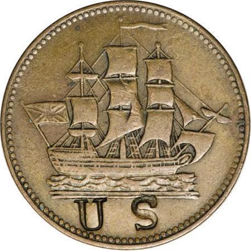 <B>Scarce Counterstamped Breton-997 Token.</B></I> Copper, 27 mm, <B>Breton-997, PE-10-30</B></I>, This token is very unusual with the counterstamp <B>" U.S." </B></I>and it has an unknown catalog value. Other pieces are known with the counterstamp "PEI," presumably for Prince Edward Island, but the purpose behind such counterstamps is unknown.<BR> <BR><BR><b>Shipping:</b> Coins & Currency (<a target="_blank" href="http://www.heritageauctions.com/common/shipping.php">view shipping information</a>)