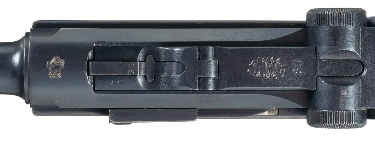 This is a very nice example of a scarce "Totenkopf" Death's Head Luger pistol. Though later associated with the Nazi SS units, the symbol was first used by the "Stormtrooper" trench raiding teams and flamethrower squads of the First World War. Fixed sights and undated chamber, with the "Lazy S" stamped next to the Death's Head on the chamber and the DWM monogram on the toggle. The right side of the barrel extension is marked with three "Crown over Script" proofs and one Imperial Eagle proof, which is repeated on the side of the breech, and a commercial "crown / N" commercial proof on the barrel, extension, frame and on top of the breechblock. Correct "GELADEN" and "GESICHERT" markings on the extractor and safety area respectively, matching numbers, checkered grips and straw color on the small parts. With a later production blue finished aluminum base magazine.