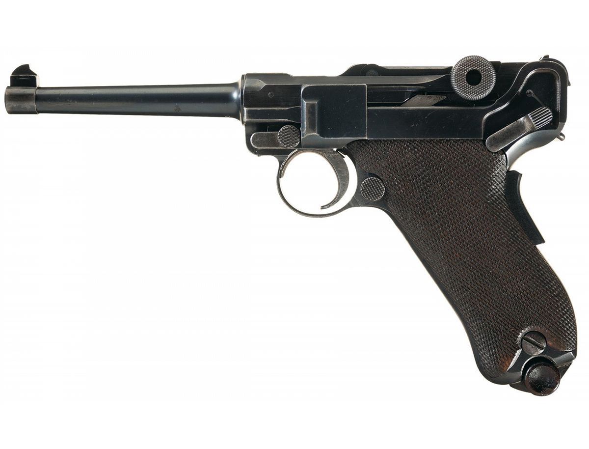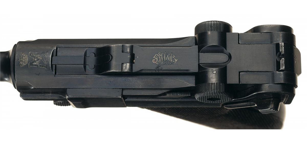 This is an example of one of the approximately 5,000 Model 1906 DWM Lugers made for the Royal Portuguese Army. The barrel extension is marked with a triangle in a circle on the left side, "CARREGADA" marked extractor and "DWM" monogram on the toggle. The Royal Portuguese Crest of Manuel II is located on top of the chamber. Visible numbers match. Blue finish with straw colored small components, grip safety, nickel magazine with wood base and checkered grips. The holster is stamped "A.E" on the inside and holds a cleaning rod.