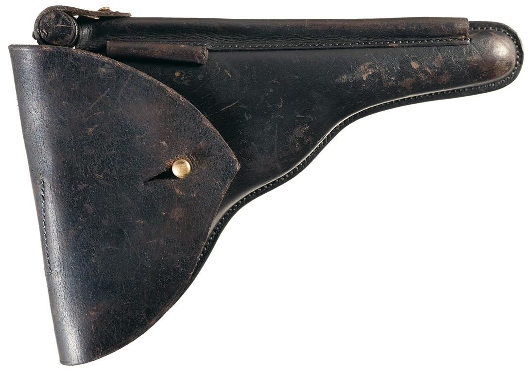 Fine. The pistol retains 70% faded dull arsenal blue finish with a smooth brown patina on the balance. Some pin point pitting is present mostly near the muzzle. The small parts retain traces of original straw color. The grips are fine with some wear and a thumb print size indentation on the right panel. The holster is good with age cracking and handling marks. Stitching is tight.