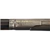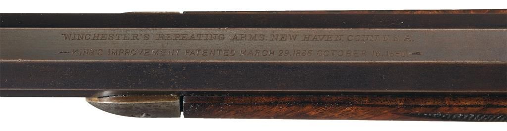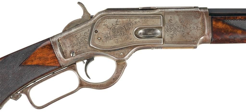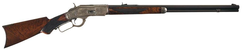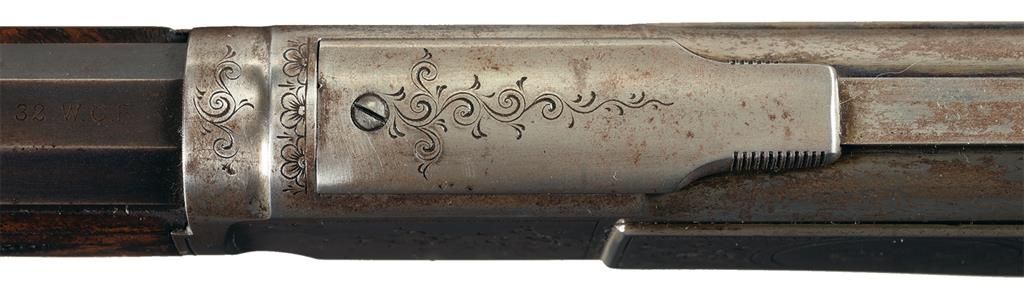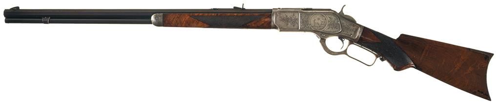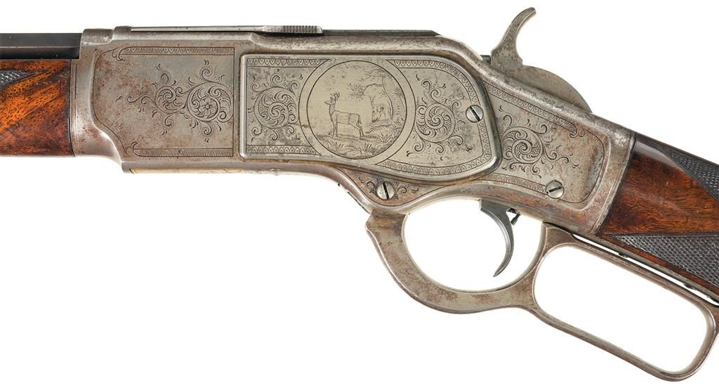 This is a rare example of a Factory Engraved Winchester Deluxe, Model 1873 Lever Action rifle that was manufactured in 1890. The rifle has the Third Model receiver with integral dust cover rail and rounded top and dust cover with serrated finger guides on the edges. The 24 inch octagon barrel, full length magazine, dust cover and loading gate are blued. The forearm cap, receiver, hammer, lever and crescent buttplate are color case-hardened. The forearm and pistol grip stock are highly figured, fancy grain, walnut with Winchester "Style H" checkering and a piano finish. The pistol grip has an ebony insert. The barrel has a "Rocky Mountain" style front sight and buckhorn, sporting style rear sight. The receiver is fitted with a special order, single set-trigger. The forearm cap, side plates, top, bottom and sides of the receiver, upper receiver tang dust cover, cartridge elevator and buttplate heel are decorated with the equivalent of Winchester No. 10 engraving consisting of open scrollwork on a punch-dot background and double-line, scalloped, borders. A circular panel on the left side plate is engraved with a detailed game scene that depicts two white tail deer. The engraving was executed by John Ulrich. The top barrel flat is roll-stamped: "WINCHESTER"S REPEATING ARMS NEW HAVEN. CONN. U.S.A./-KING'S IMPROVEMENT PATENTED MARCH 29. 1866. OCTOBER 16. 1860.-" in two lines ahead of the rear sight. The caliber, "32 W.C.F." is roll-stamped on the top barrel flat just in front of the receiver. "32 CAL" is roll-stamped in script of the bottom of the cartridge elevator. The upper tang is roll-stamped: "{ MODEL 1873}" in fancy letters with foliate devices at either end. The serial number, "377917" is stamped in small script letters across the lower tang behind the lever latch.