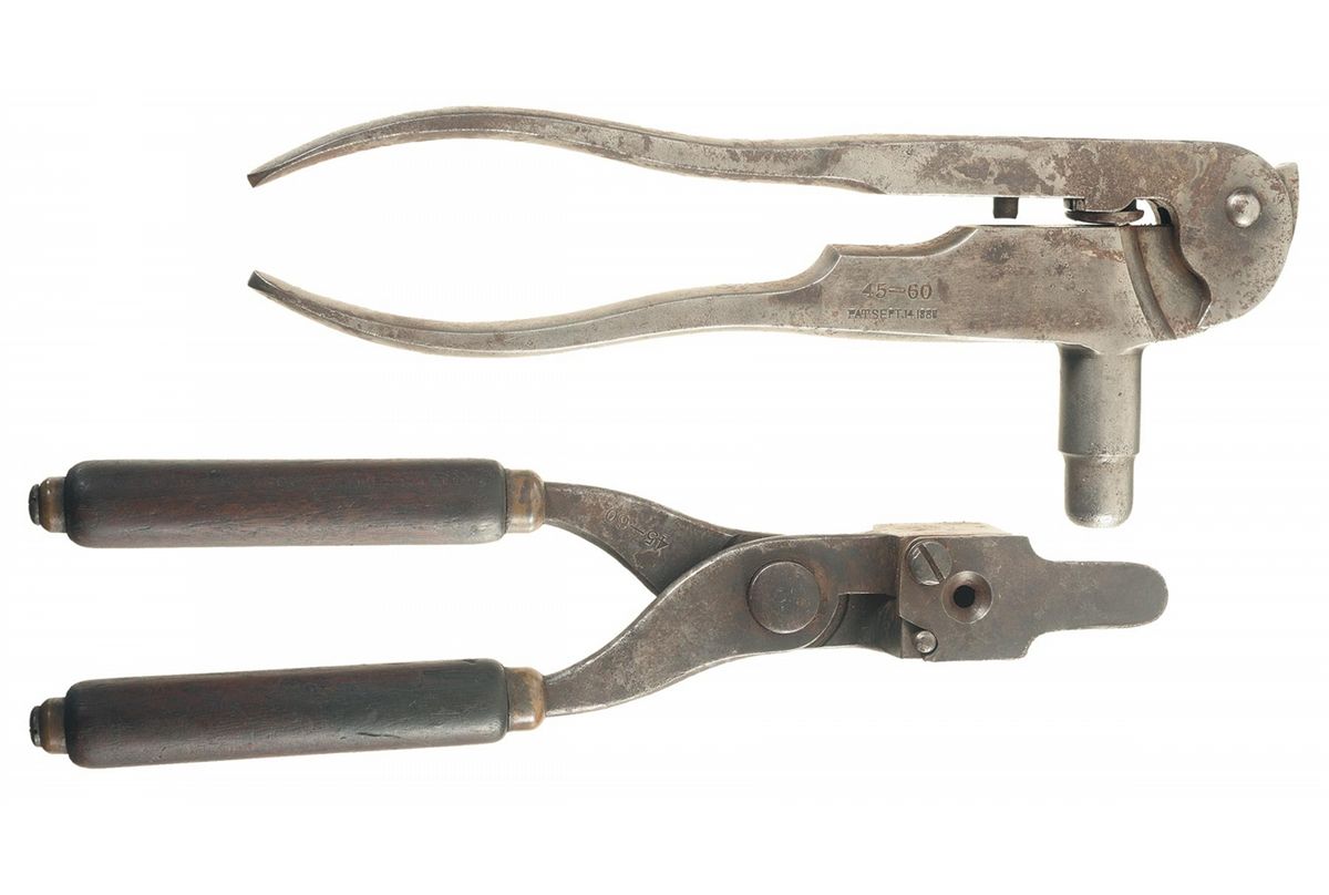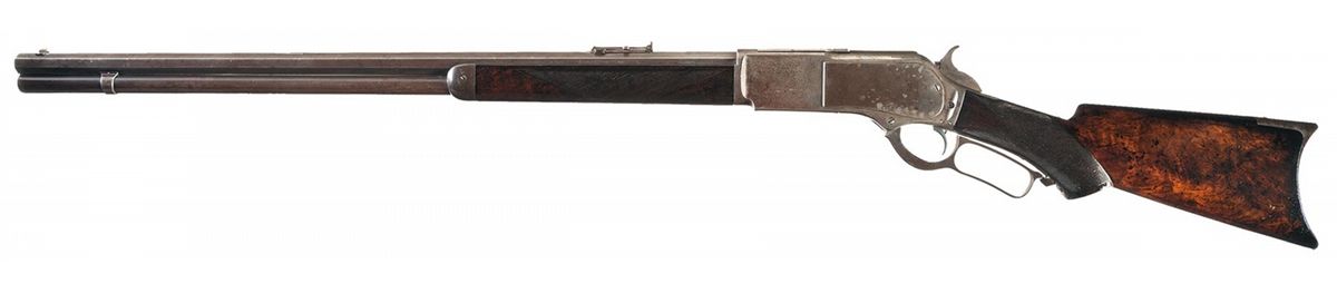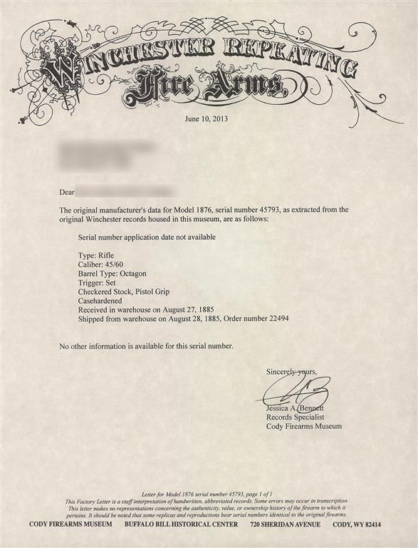 Third Model manufactured in 1885. This rifle has a blue barrel with full-length magazine and color casehardened forearm cap, receiver, hammer, lever and crescent buttplate. The forearm and pistol grip stock are highly figured fancy grain walnut with Style H checkering. The pistol grip has an ebony inlay. The Third Model receiver has an integral dust cover guide and dust cover with serrated finger guides. The barrel has a standard sporting style front sight with nickel silver blade and a folding leaf rear sight with "1876" on the top of the leaf. The receiver has a special order single set-trigger and the buttplate has a sliding brass trap door. The upper tang is drilled and tapped. The top barrel flat is roll stamped "-WINCHESTER'S-REPEATING ARMS. NEW HAVEN. CT.-/KING'S-IMPROVEMENT-PATENTED-MARCH 29. 1866. OCTOBER 16.1860." ahead of the rear sight. The caliber designation "CAL. 45-60" is stamped on the top barrel flat just ahead of the receiver. "{ MODEL. 1876.}" is roll stamped on the upper receiver tang in fancy letters with foliate designs at either end. "45-60" is stamped in script numerals on the bottom of the cartridge elevator and the serial number "45793" is stamped in tiny numerals across the lower tang between the lever latch and the tang screw. The accompanying factory letter verifies the rifle configuration, caliber, octagon barrel, set trigger, checkered pistol grip stock, casehardened, that it was received in the warehouse on August 27, 1885 and shipped to order number 22494 the next day. Comes with an iron single cavity 45-60 bullet mold with wooden handles and a Winchester 45-60 reloading tool.