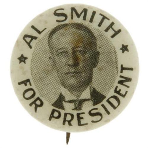 <B> Scarce Design Picturing Al Smith </B></I> encircled by the slogan " For President". This Brunt made photo button shows a full forward picture of the candidate in a 7/8" size celluloid button. A tough example to find, this piece has minor spotting around the curl and a faint spot on the face. The backpaper displays the information from the manufacturer.<BR><BR><b>Shipping:</b> Miscellaneous Collectibles, Smal (<a target="_blank" href="http://www.heritageauctions.com/common/shipping.php">view shipping information</a>)