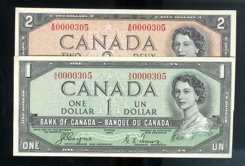 Scarce Devil's face matched pair with low serial number. Includes BC-29a and BC-30a both 1954 $1 and $2 Devil's serial #0000305. The two notes are GEM!