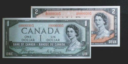 Scarce Devils face matched pair with low serial number 0000305. Includes BC-29a and BC-30a both 1954 $1 and $2 with Devils face portrait. The two notes are GEM!