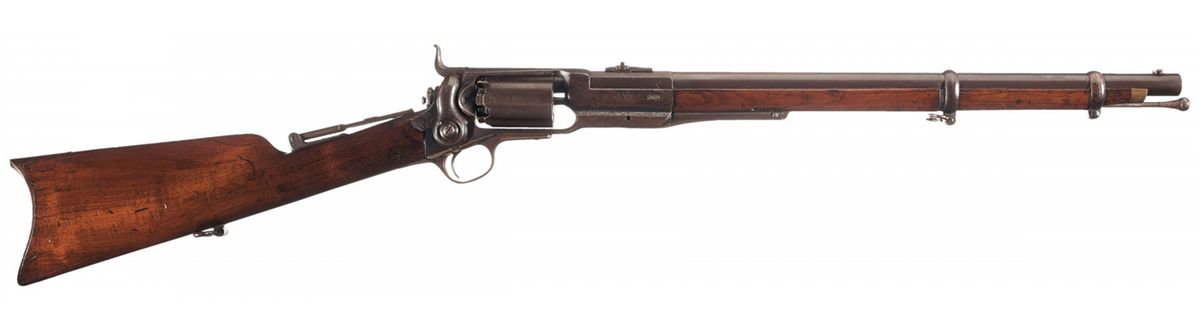 Manufactured circa 1856-1864. Part of a line of revolver-type long arms which enjoyed some success, but in many ways was ahead of its time. This particular Sporting Rifle is 1 of only 800 44 caliber Sporting Rifles manufactured and 1 of only 50 made in 44 caliber with a 21 inch barrel. This particular rifle is pictured in "The Book of Colt Firearms" by Wilson and Sutherland on page 192, identified by serial number and described. Its described as having a barrel length of exactly 21 1/8 inches in the book, which is the case. The top strap is marked "{COLT'S PT./1856} and {ADDRESS COL. COLT/HARTFORD, CT. U.S.A.}. The matching serial number is marked on the bottom of the frame, trigger guard tang and on the toe of the buttplate. The brass blade is missing from the front sight, the dovetailed base remains, the rear sight is the correct three leaf folding variation with 100, 300 and 600 yards graduations. The rifle is fitted with a rare tang mounted peep sight. The rifle was fitted at a later date with the cylinder latch screw on the left side of the frame. All blue finish, iron cleaning rod and mounted with a varnished full length forearm with brass forend, sling swivel on the rear barrel band and straight grip stock with a crescent buttplate, with compartment and a sling swivel.