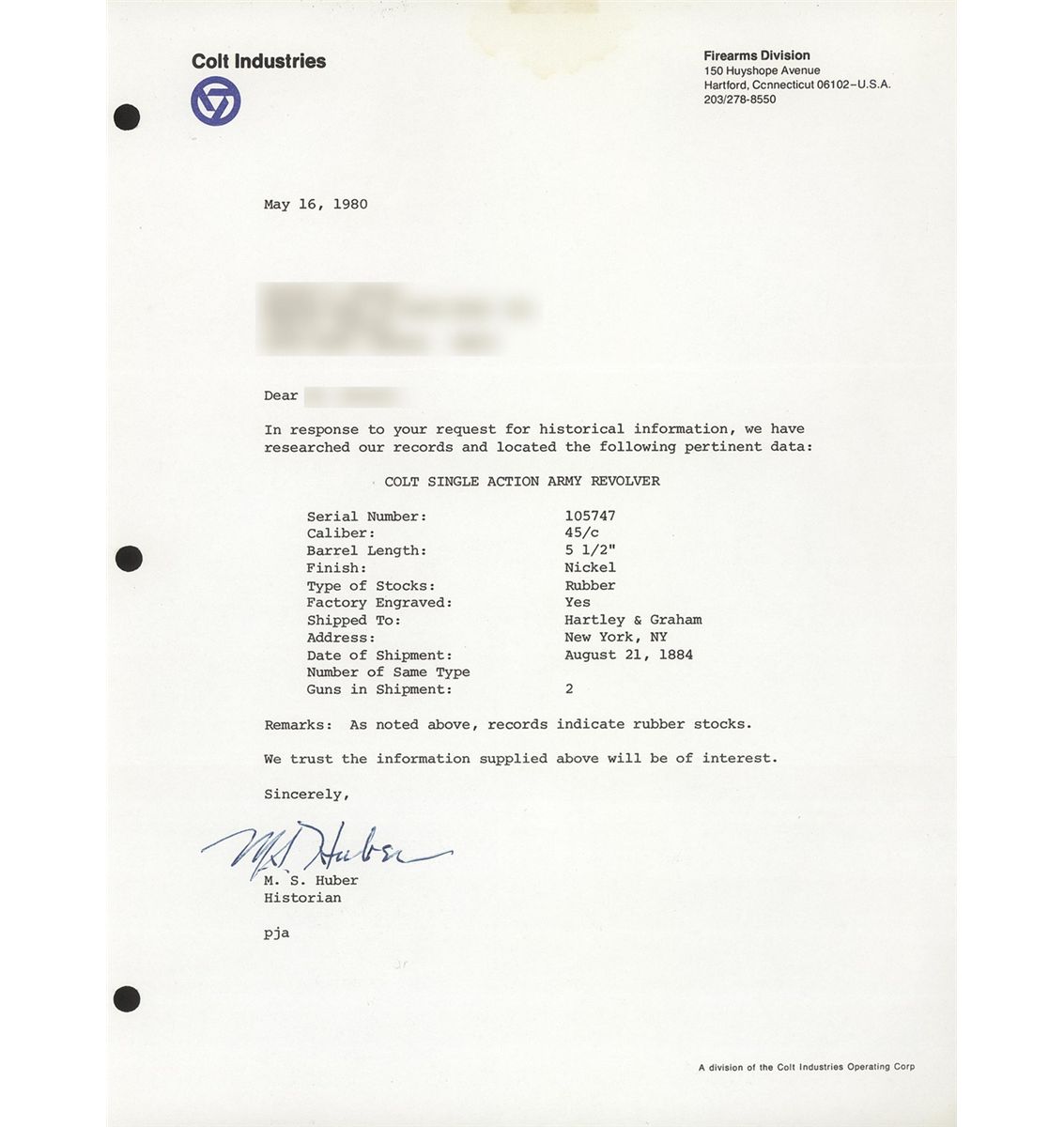 Manufactured in 1884. The revolver features an all nickel finish with niter blue screw heads and factory engraving. The rear sides of the barrel, cylinder flats and frame sides have floral scroll engraving. There is a star burst on top of the barrel near the muzzle and on each side of the upper front of the frame. The recoil shield and loading gate have a shell design, and the top and back straps have a simple decorative dot and zigzag design. The butt is inscribed "ABA" in script letters, (origin unknown at time of writing). The top of the barrel is marked with the two line address, the left side of the frame has the three line, three patent dates and "45 CAL" is on the upper left front of the trigger guard. The matching serial number is marked on the bottom of the frame, trigger guard and back strap. Standard blade front and frame notch rear sights, and fitted with two piece pearl grips with a relief carved American eagle motif on the right side. The accompanying factory letter verifies the caliber, barrel length, nickel finish, factory engraving, rubber grips at the time of shipment and that it was shipped as 1 of 2 to Hartley & Graham, N.Y., N.Y. on August 21, 1884.