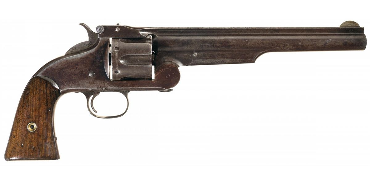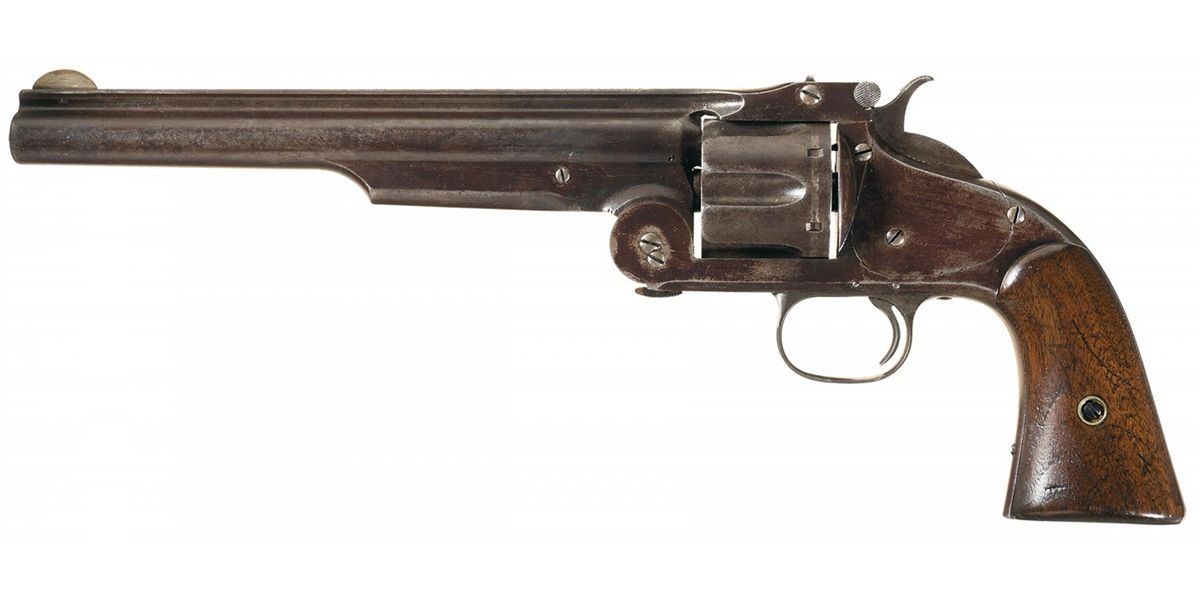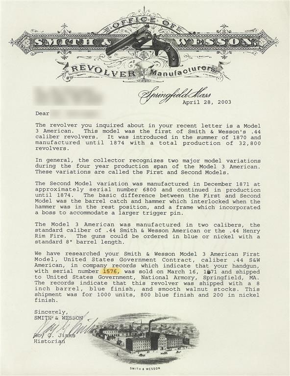 As confirmed by the included factory letter this S&W Model 3 American First Model Revolver was sold on March 16, 1871 and shipped to the United States Government, National Armory, Springfield, MA. The revolver was part of a shipment of 1,000 units, 800 blue finish and 200 in nickel finish. The letter confirms the 8 inch barrel, blue finish and smooth walnut grips. The consignor notes state that the revolver has belonged to many S&W collectors including Floyd Jackson, Karl Rienhardt, Gary Garbrecht and Dave Berghoff. Surviving examples of U.S. martial Model 3 Americans are scarce and highly desirable. The barrel rib is marked ""+ SMITH & WESSON SPRINGFIELD MASS.U.S.A.PAT.JULY 10. 60. JAN. 17. FEB. 17. JULY 11. 65 &AUG. 24. 69 + " followed by "US". A small "A" ordnance sub-inspection mark is present on the left side of the frame under the cylinder, a cylinder flute and barrel top strap and an ordnance "P" proof marked is stamped on the right side of the frame. The rear of the cylinder, barrel latch and the barrel are marked with the letters "OU." Matching numbers are found on the butt and right grip panel.