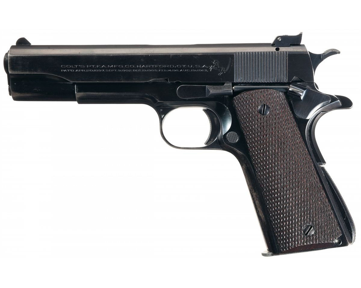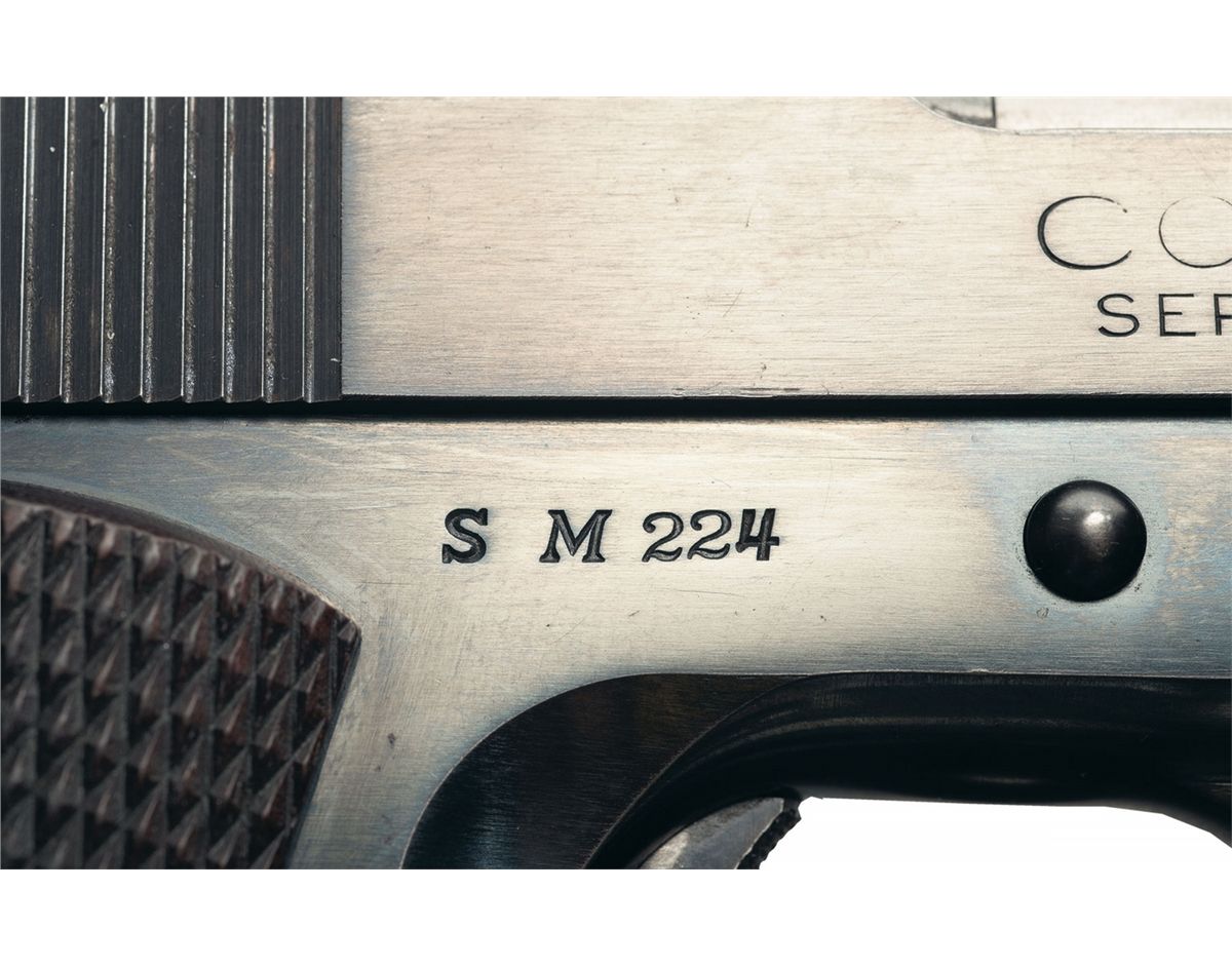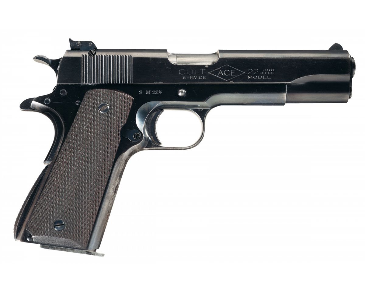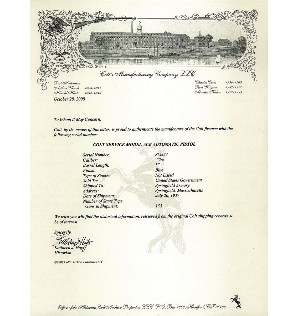 This is a very early Colt Service Model Ace 22LR pistol manufactured in 1937, the third year of production, (only 50 were produced in the previous 2 years). These early issue pistols are very rarely found as most saw extensive use. These pistols were developed in the late 1930s to duplicate the weight, feel and recoil of the Model 1911A1 pistol while firing the economical 22LR cartridge. The left side of the slide is marked with the Colt two line address/1897-1913 patent dates followed by the Rampant Colt. The right side of the slide is marked "COLT/SERVICE ACE (inside the a diamond) 22 LONG/RIFLE/MODEL" The right side of the frame is marked "SM224". It is fitted with the early screw adjustable rear sight and the magazine is marked "COLT/22 ACE L.R./SERVICE MODEL" on the bottom. It has the checkered arched main spring housing and early Colt wide checkered hammer and fitted with checkered walnut grips. The accompanying factory letter verifies the serial number, caliber, barrel length, blue finish with grips as "Not Listed" and that it was shipped as 1 of 155 to the United States Government, Springfield Armory, Springfield, Massachusetts on July 20, 1937.