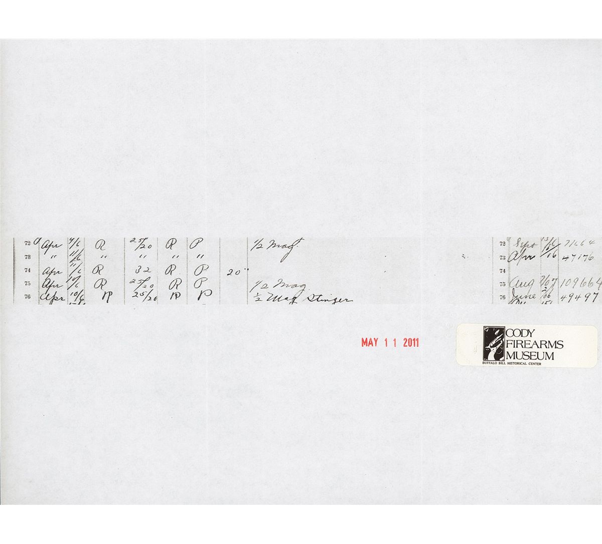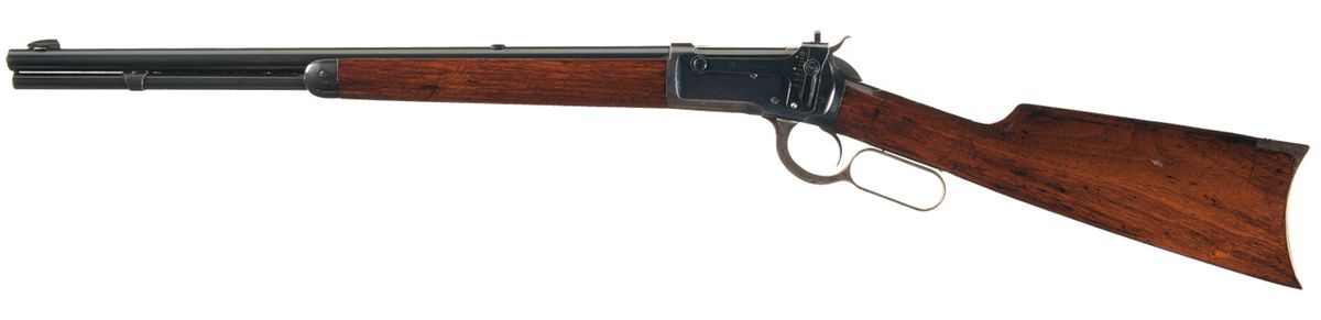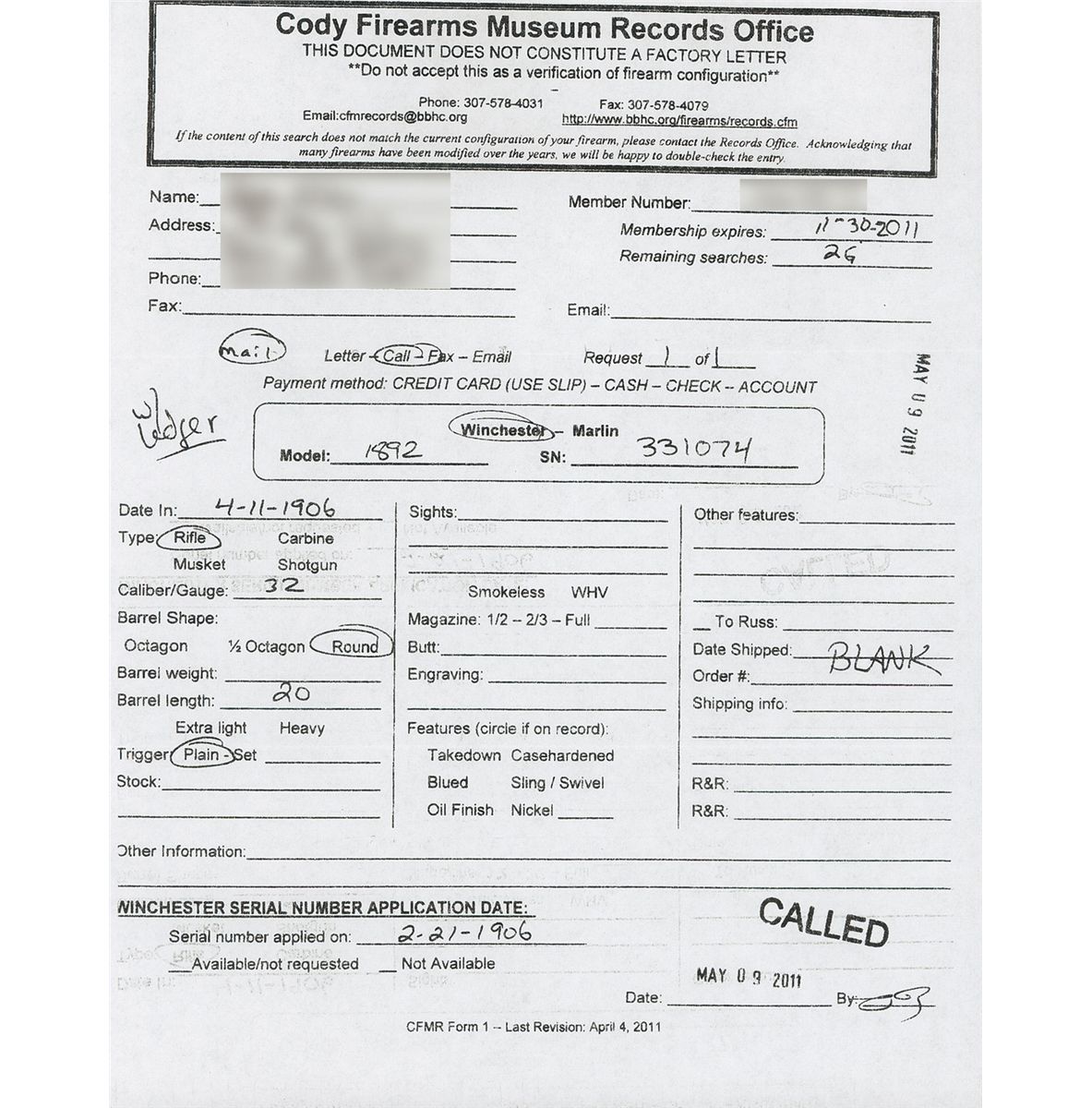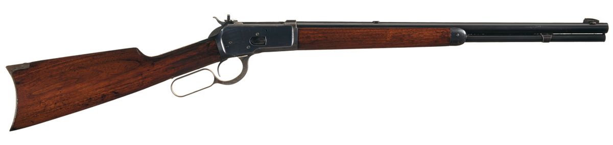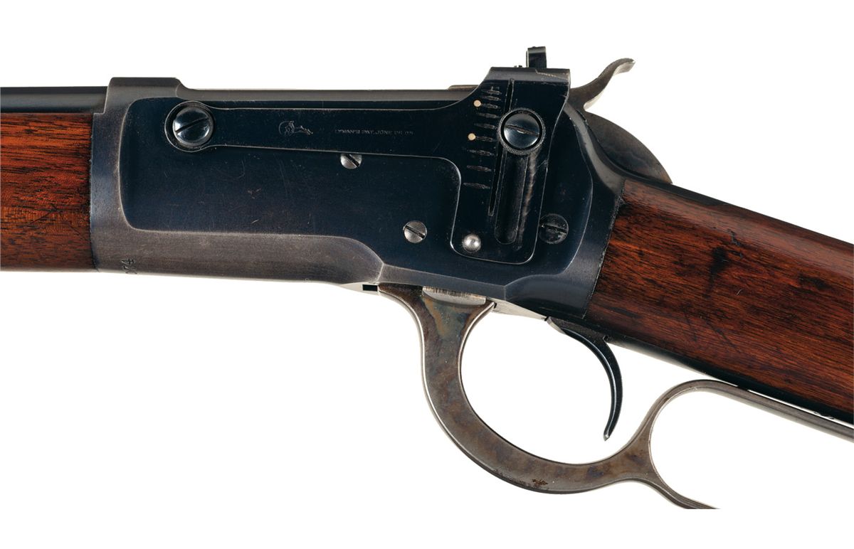 This is a Winchester Model 1892 Short Rifle with rare 20 inch round barrel. The rifle is accompanied by a Cody Firearms Museum Records Office letter that describes it as: "Rifle, caliber 32", with round, 20 inch barrel and plain trigger. The letter states that the serial number was applied on "2-21-1906". The rifle has a blue barrel, magazine, forearm cap and frame. The hammer, lever and crescent buttplate are color casehardened. The straight grain American walnut stock and forearm have an oil finish. The barrel has a dovetail mounted Sheard front sight with brass bead and a factory blank in the rear sight dovetail. A Lyman "DB" receiver sight is mounted on the left side of the frame. The upper tang is factory drilled and tapped. The rifle has a full length forearm. The top of the barrel is rollstamped "MANUFACTURED BY THE WINCHESTER REPEATING ARMS CO./NEW HAVEN. CONN. U.S.A. PATENTED OCTOBER 14. 1884." in two lines ahead of the rear sight dovetail. The caliber designation "32 WCF" is stamped on the top of the barrel just in front of the frame. Winchester oval "W/P" proofmarks are stamped on the top of the barrel in front of the caliber markings and on top of the frame. The upper tang is roll stamped with the second style model designation "MODEL 1892/-WINCHESTER-/TRADE MARK" in three lines. The serial number, "331074" is roll stamped across the bottom of the front of the frame. Model 1892 Short Rifles are scarce; most purchasers of short-barreled Model 1892 Winchesters preferred carbines.