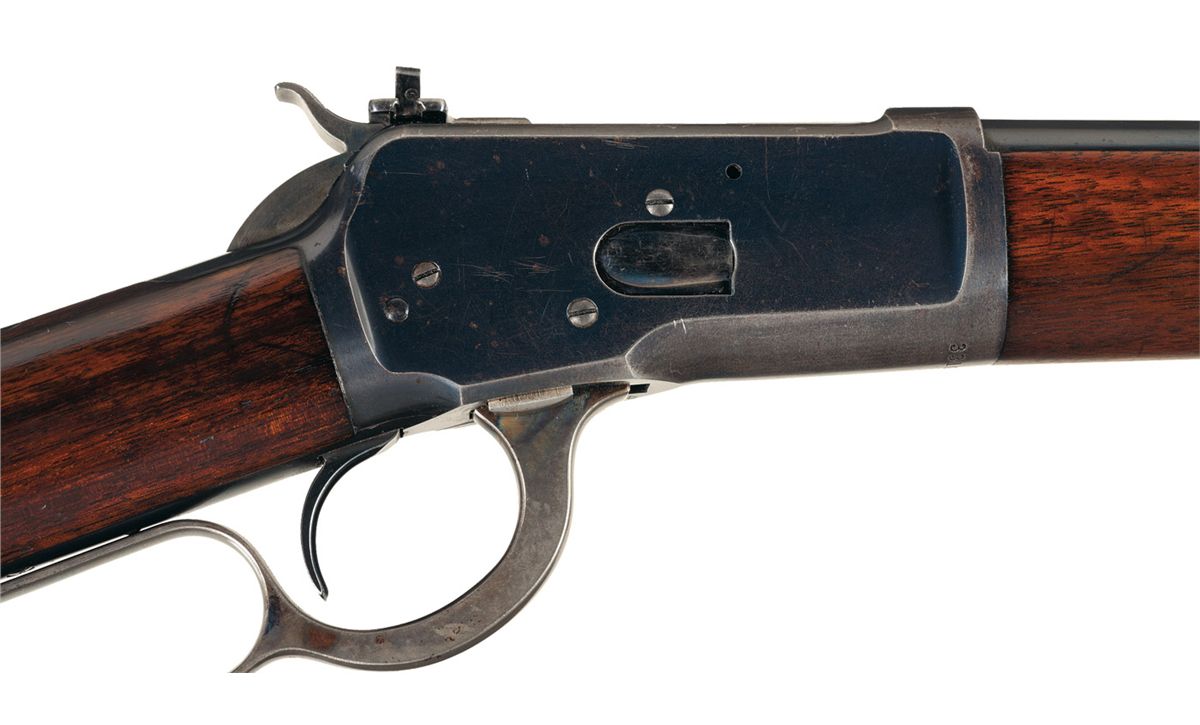 Excellent. The barrel and magazine have 95% of the original blue finish intact with some minor edge wear at the muzzle. The frame has 85% plus of the bright original blue finish with edge wear on the sides and top and thinning on the bottom ahead of the lever. The top of the bolt has some cycling wear caused by contact with the rear sight. The hammer, lever and crescent buttplate retain 60% of the casehardened finish. All of the markings are crisp. The stock and forearm are both in excellent condition and retain 90% of the original oil finish. Wear is limited to a few minor handling marks and some finish wear on the forearm. The rear sight is missing the locking lever. This is an excellent example of a scarce Winchester Model 1892 Short Rifle.