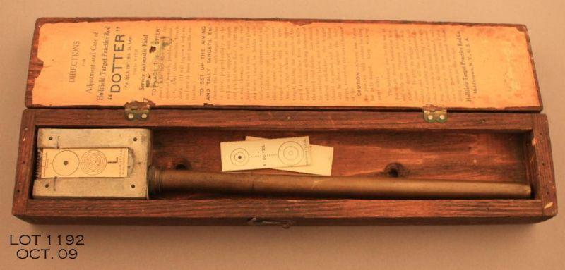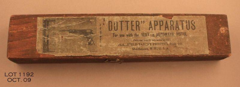 Scarce ‘Dotter’ Apparatus for use with the Service Automatic Pistol in its original wood box with label in overall good condition. These target testing devices were made to allow 1911 owners to “test” the sighting and/or trigger pull of arespective weapon. This set is in overall very good condition with instructions inside the lid of the wood box that is approx. 11” long x 2” wide x 1” in height; the brass device shows a great dark patina and there are several targets still in th set. A great 1911 accessory. Est.: $150-$300.