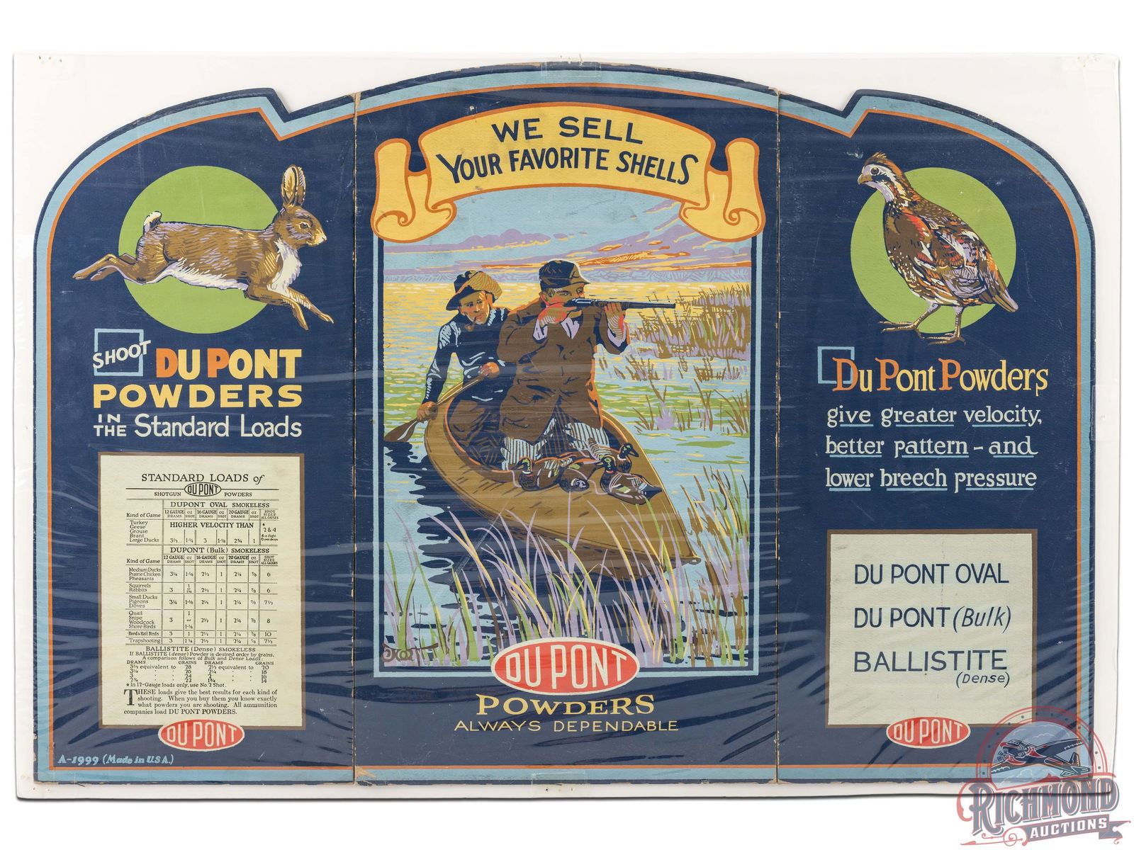 Hard to find cardboard lithograph tri-fold sign with vibrant colors and graphics. Features two duck hunters in a canoe, rabbit, bobwhite quail and chart of standard DuPont loads. Reads "DuPont Powders, Always Dependable. Exhibits general storage and age wear predominately along the edges and fold lines. Appears that each panel is detached. There are a few minor indentions, above the bobwhite's head and in/around the yellow scroll banner. Excellent eye appeal for this tough to find piece. Shrink wrapped and secured to foamboard. Marked A-1999 (Made in USA) on bottom left corner. 25.5" H x 37.5" W.