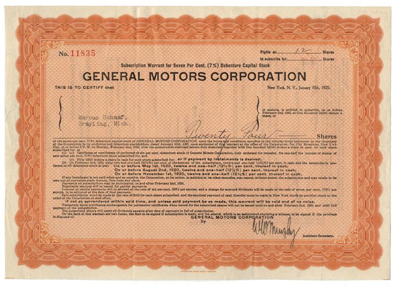 1920, New York. Subscription warrant for 7% debenture capital stock for 24 shares. Orange/Black. Small tear at left edge repaired on verso. Uncancelled and very good.