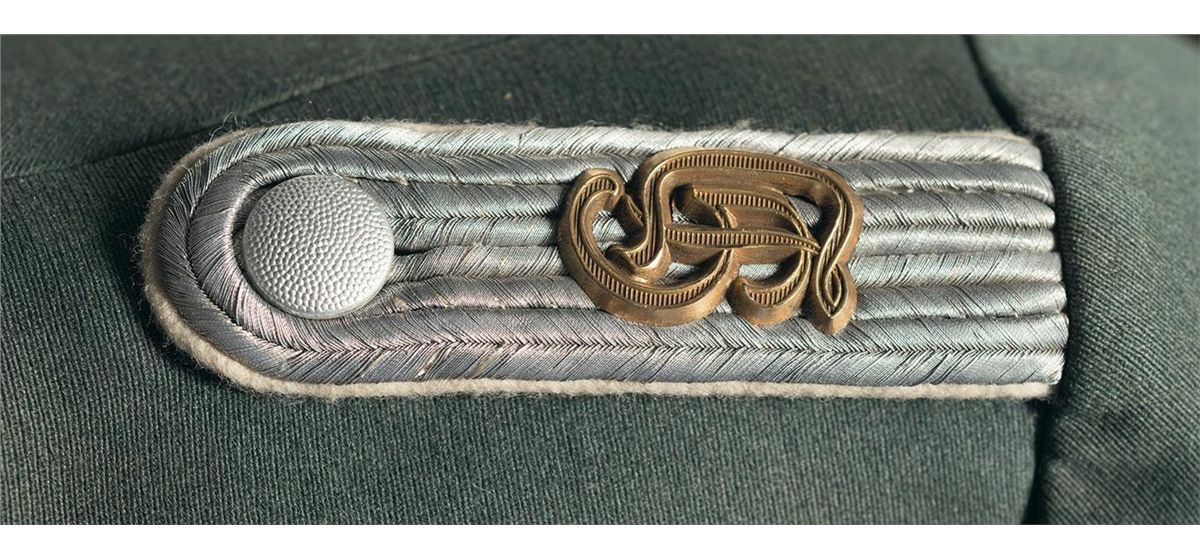 Starting life in the Weimar Republic as the Wachregiment Berlin and Kommando der Wachtruppe and serving as the security unit for Berlin, the Infantry Regiment Grossdeutschland (Greater Germany) was formally named in 1939, drawing soldiers from all reaches of Germany, in opposition to the regionally recruited units of the Imperial and Weimar militaries, intended to serve as a flagship unit for the Heer, with the most advanced equipment available and a special set of dress uniforms. These uniforms, designed to invoke the image of the older Imperial units, were only used on parade detail, with more conventional uniforms worn in combat. Grossdeutschland would undergo several expansions and changes during it's activities in France and on the Eastern Front, upgrading to Panzergrenadiers and combining with the elite commandos and infiltrators of the Brandenberg Division to form the Panzerkorps Grossdeutschland, which continued to fight to it's effective extermination in 1945. Gray/green "feldgrau" construction, with the signature long double-bar collar litzen on the green collar, white waffenfarbe piping, silver bullion accented cuffs and the silver braid Lieutenant's shoulder boards with gilt "GD" devices. The right breast bears a silver bullion Nazi eagle, and the right sleeve bears the silver bullion "Grossdeutschland" cuff title. The interior is green cloth lined with integral belt, a faint ink stamp inside the right breast, and an internal pocket on the left which contains a nametag. The tag, from maker "Johann Ebinger", bears a faint ink signature.