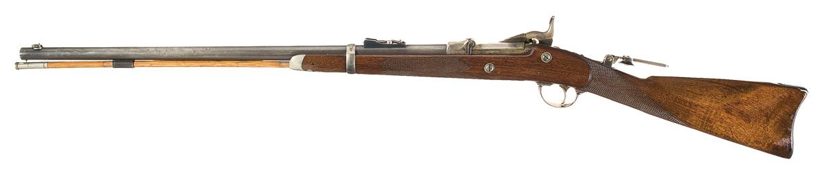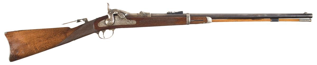 This is an example of a Springfield Type I, Model 1875 Officer's Rifle that was manufactured circa 1876-1877. The rifle has a blued barrel and casehardened barrel band, receiver, breechblock, hammer, lock plate, trigger guard and buttplate. The oil-finished, black walnut stock has a checkered wrist and forearm with engraved, German silver forearm tip. The rifle has the early, 1876-1877 features that include: (1) a 'high arch' breechblock marked "MODEL/1873/Eagle Head/Crossed Arrows/U.S.", (2) lock plate is roll-stamped with the Springfield Eagle and shield motif followed by "U.S./SPRINGFIELD/1873" in three lines, (3) small "V/P/Eagle Head" proof and inspection marks on the left side of the barrel and (4) Model 1873 Rifle rear sight graduated to 400 yards on the right side of the base and 1200 yards on the leaf. The barrel is fitted with a single ramrod thimble that secures a hickory ramrod with nickel-plated brass tip and wiper ferrule. The barrel has a dovetailed Beach folding globe front sight with brass pin. A Springfield altered Sharps folding Vernier rear sight is mounted on the stock wrist. The rifle is fitted with a single set trigger. The rifle has a carbine trigger guard with no sling swivel and a smooth trigger. The forearm tip, barrel band, receiver, breechblock tang, hammer, lock plate and buttplate are all decorated with well-executed scroll engraving. The rifle is correctly not serial numbered. The left side of the stock has an oval cheek recess that definitely is of the period and quite possibly may have been an alteration by Springfield Armory. Springfield Armory manufactured approximately 125 of these rare and desirable Type I Officer's Rifle between 1875 and 1877.