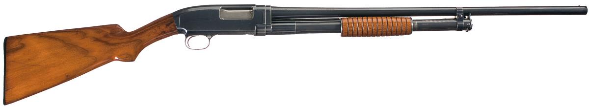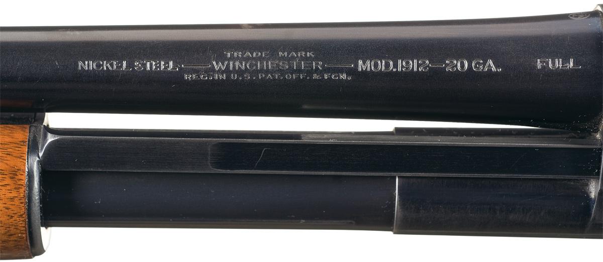 This model was designed by T.C. Johnson and was the first of the slide action hammerless shotguns built by Winchester, enjoying great success with over 1,900,000 sold. This high quality, well made shotgun is still in use in the hunting and shooting fields across the country. All Model 12's are of the takedown variation. Manufactured in 1913, the second year of production. Equipped with a single brass bead sight on the plain barrel, choked full. Mounted with a thirteen groove forearm and plain pistol grip stock with a black hard rubber buttplate marked "WINCHESTER REPEATING ARMS CO." in a circle. The 25 inch barrel was only made from 1912 to 1914. Length of pull is 13 5/8".