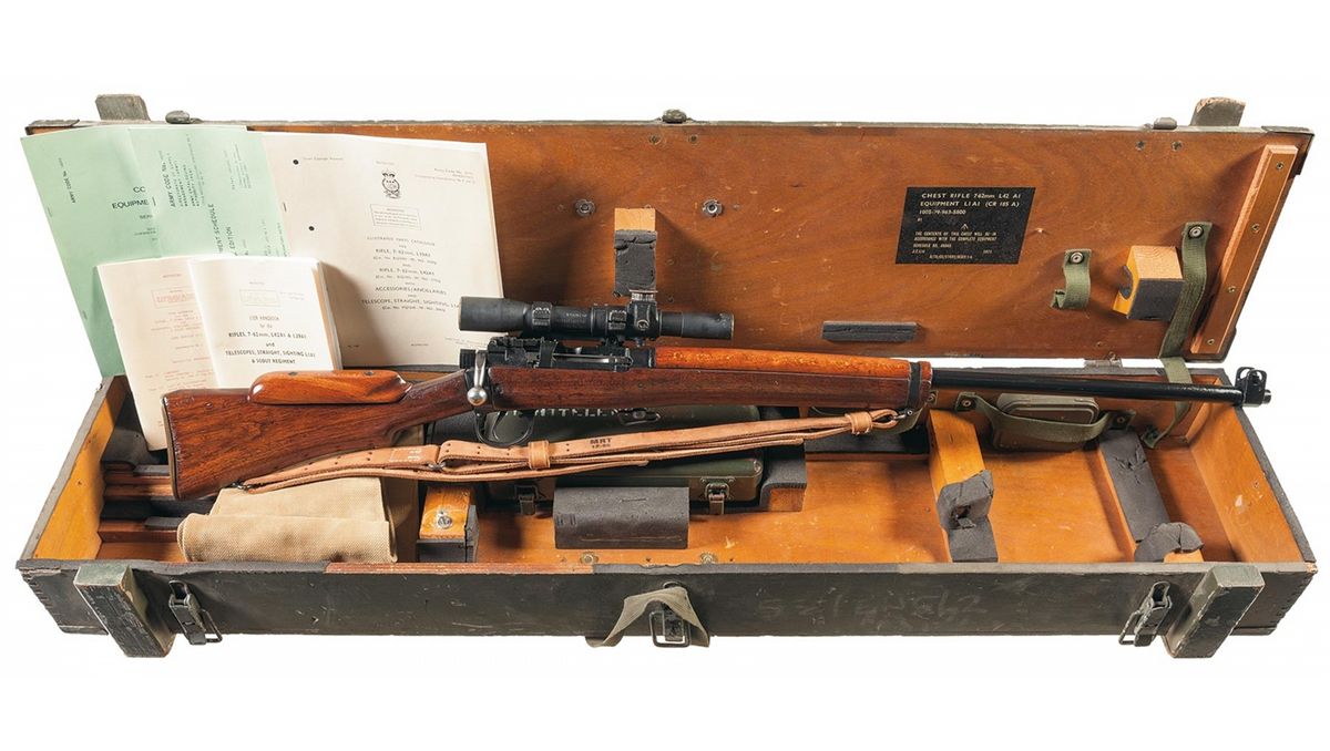 Developed in the 1960s and deployed in the 1970s, the Enfield L42A1 was an upgrade of the Number 4 Mark I (T) sniper rifle configured for use with 7.62x51 NATO ammunition, fitted with a high pressure bolt head and hammer forged target barrel. Additionally, Model 32 Mark III scopes were also upgraded to match the new caliber. About half of the approximately 900 rifles made were condemned and destroyed post-service by the Ministry of Defense. Standard sights and import marked barrel. "19T" on top of the extractor assembly and bolt handle, and "L42A1 D71" on the left side of the receiver. The old scope markings were lined out with the new NATO markings of "1240-99-963-2063/TEL.STRT.STG.L1A1/OS 2429 G.A./No26070" engraved on the tube, the base numbered to match the rifle, and "M299" and "M300" on the rear and front rings, respectively. Smooth stock with "58/1" carved into the left side of the wrist, a hardwood cheekpiece mounted to the comb, a brown leather sling marked "MRT/12-86" and a brass buttplate. Included with the rifle is a green painted hardwood shipping case, bearing a Royal Air Force shipping label on the lid, a L42A1/L1A1 nomenclature plate on the inside, cases for cleaning gear and the scope, copies of the operation manual and Complete Equipment Schedule, leather lens covers and a tan canvas rifle pouch.