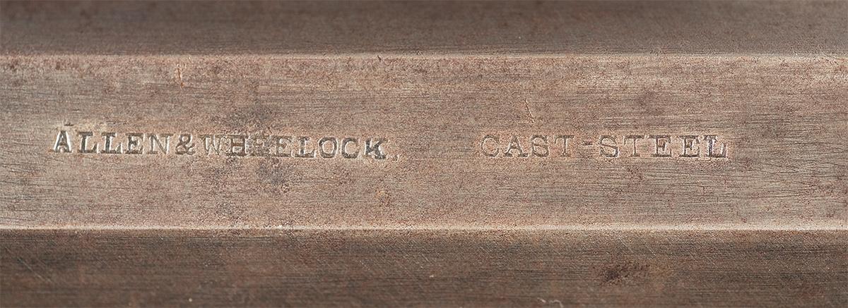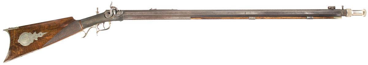 Manufactured circa 1840s into the early 1860s with production estimated at a few hundred. This example of an Allen & Wheelock side hammer muzzle loading rifle has an octagonal barrel marked ALLEN & WHEELOCK CAST-STEEL", a globe front sight, a sporting type rear sight, and a false muzzle. Scroll engraved silver receiver, trigger guard, patch box, buttstock overlay and buttplate, with the scrollwork extended to the breech plug and hammer. The patch box also has an engraved stag scene. Double set triggers and a sight mount on the receiver. Nicely figured checkered walnut straight grip stock with crescent buttplate with compartment on upper tang. Included is a bullet starter.