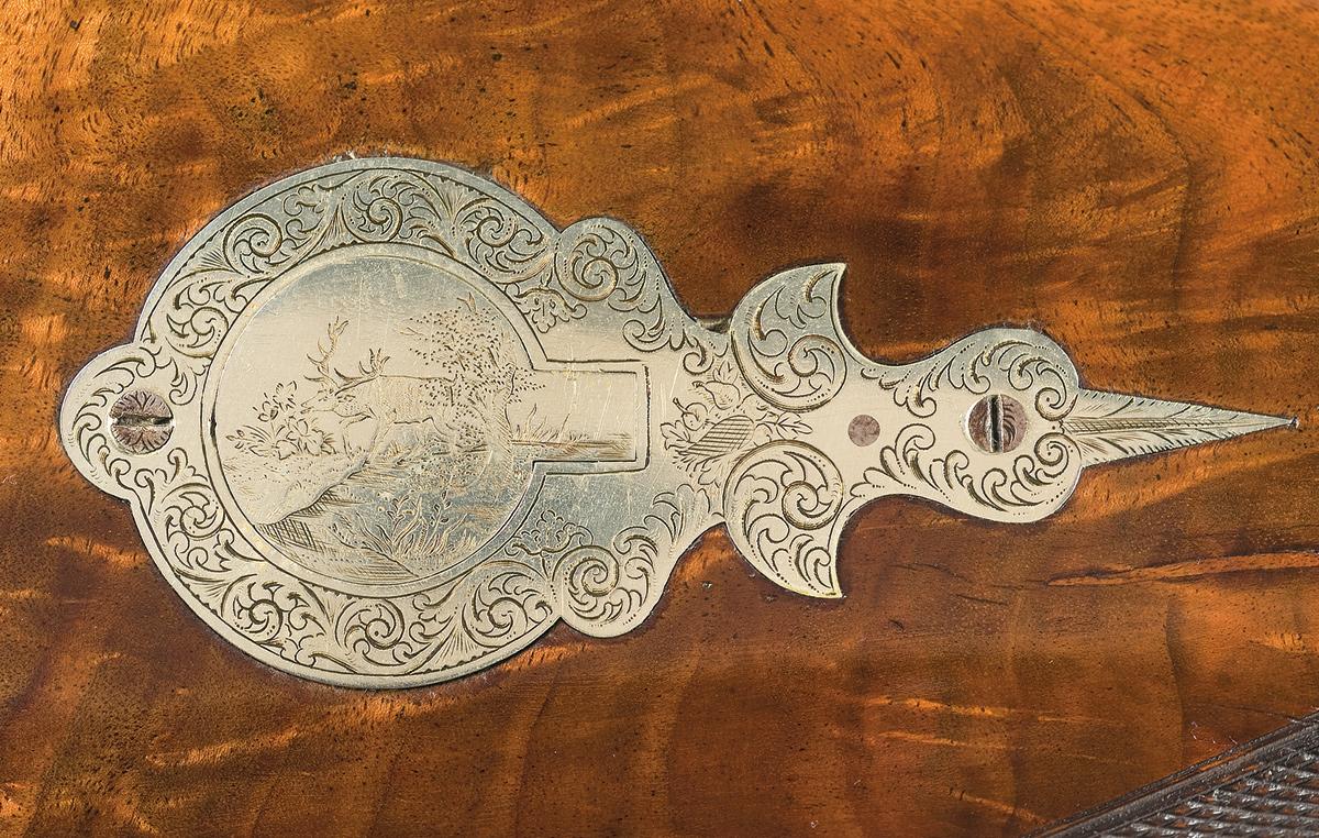 Condition: Very good plus. The barrel has a mottled gray patina with scattered traces of original blue finish with some minor pitting. Most of the silver remains with the silver on the frame having tarnished with some mild pitting mostly on the frame. The stock is very fine as restored with the exception of a minor crack near the toe and a minor gouge, along with some scattered mild dings. The checkering is crisp.