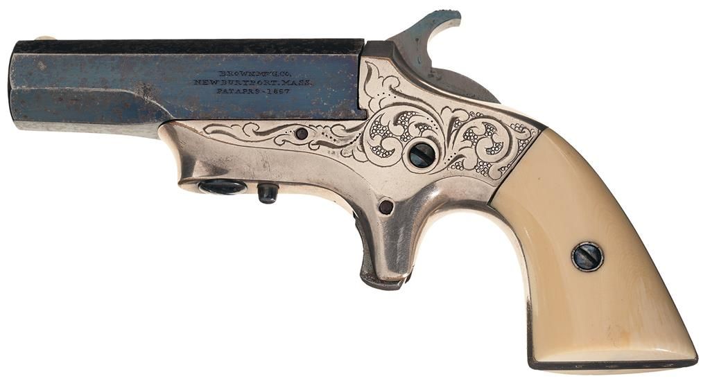 Manufactured from 1866 to 1873, this brass frame model is marked "SOUTHERNER" on the top barrel flat and "BROWN MF'G CO/NEWBURYPORT, MASS/PAT APR 9 1857" on the left side flat. The matching serial number is marked on the bottom of the barrel and on the butt. The sides of the frame and the back strap are engraved in a broad scroll pattern with a punch dot background. The barrel, screw heads and hammer are finished in high polished niter blue and the brass frame is silver plated. The barrel pivots sideways to load and there is an automatic extractor mounted on the underside of the barrel. Brass blade front, no rear sight, checkered hammer, smooth spur trigger and fitted with smooth ivory grips. There were two types of engraving on Southerner derringers. The first was full coverage. The second was as this example is with a lesser amount of engraving coverage. This is the rarer type as those who could afford engraved guns went for the full coverage. Very few of the second coverage are known, and none in this outstanding condition with ivory grips.