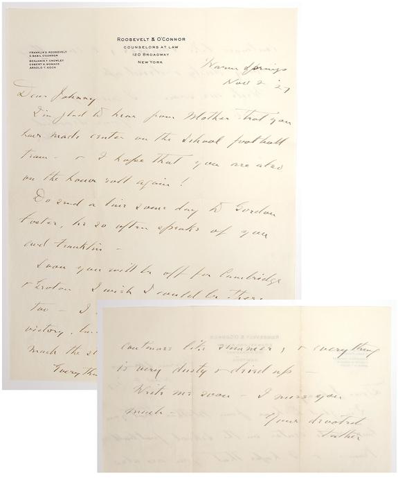 Scarce FDR ALS to His Youngest Son. Autograph letter signed ("Your devoted Father"), on "Roosevelt & O'Connor / Counselors At Law" letterhead, 1½ pp, 11x8½", Warm Springs (Ga.), November 2, 1927. Written to FDR's youngest son, John Aspinwall (1916-81), who was eleven years old: "I'm glad to hear from Mother that you have made center on the school football team - & I hope that you are also on the honor roll again! Do send a line some day to Gordon Foster, he so often speaks of you and Franklin. Soon you will be off for Cambridge & Groton. I wish I could be there too. I hope you will see a Harvard victory, but so far Yale seems to have much the stronger team. Everything goes well here & the weather continues like summer, & everything is very dusty & dried up. Write me soon. I miss you much. Your devoted Father." Fine condition.
