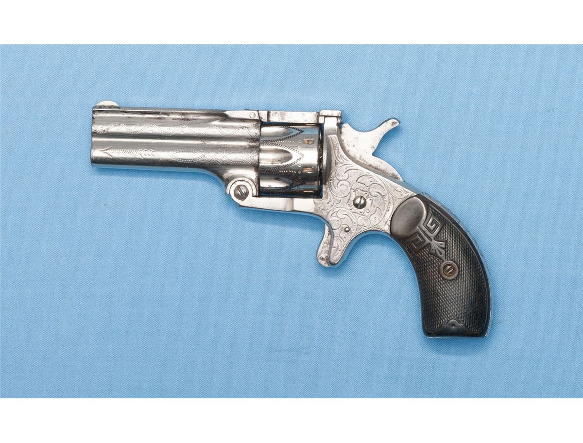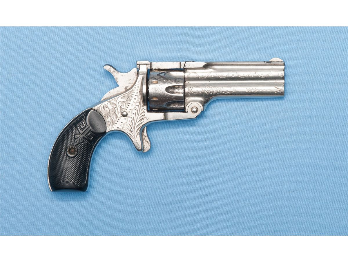 Manufactured circa 1880s. With a .22 caliber, eight shot cylinder and a .32 caliber rimfire single shot center barrel which also acts as the cylinder pin.